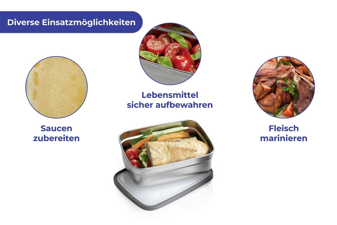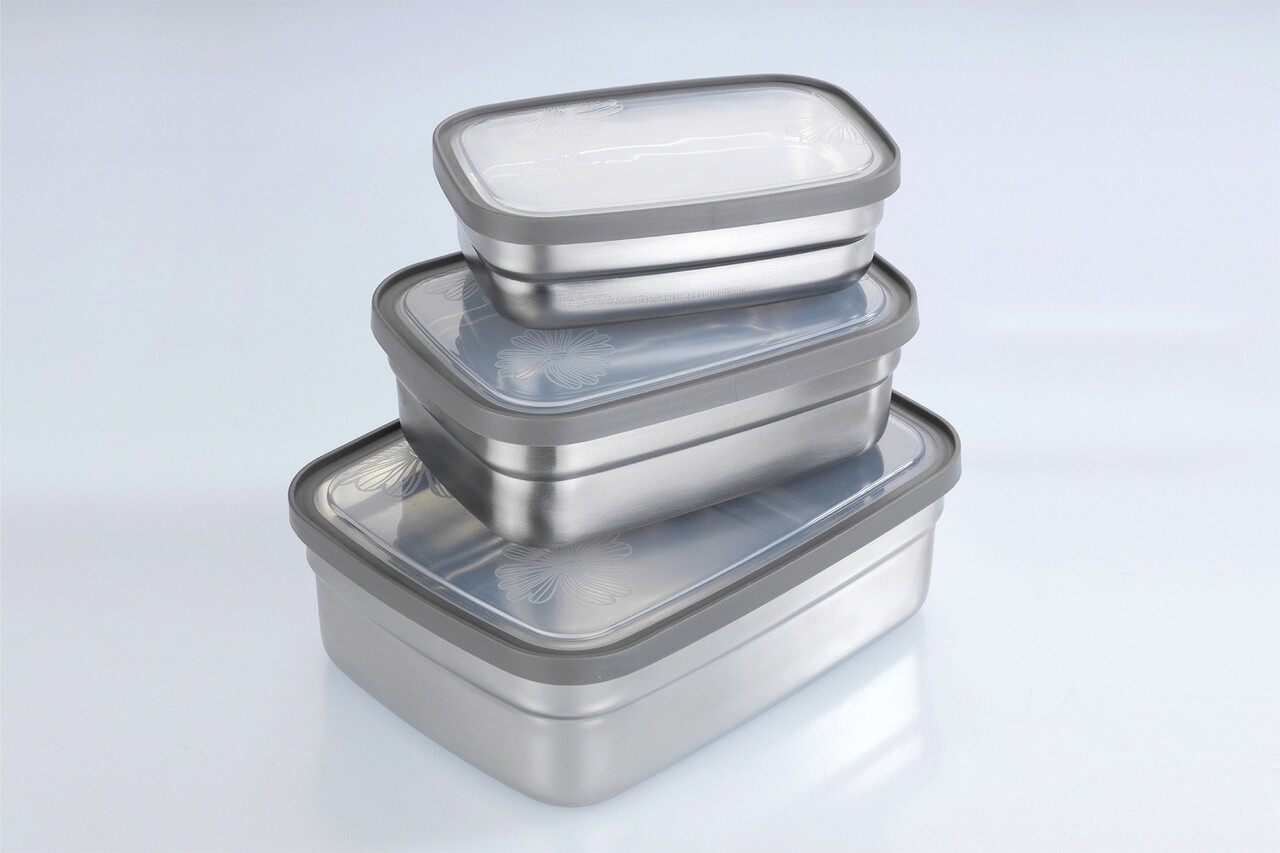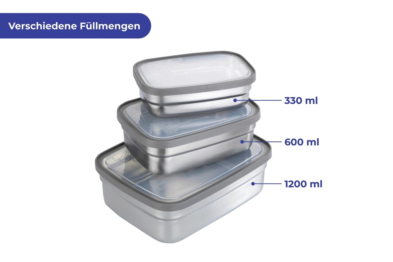 Cutiile de pranz din otel inoxidabil Maximex sunt o alternativa ecologica si, de asemenea, un loc sigur pentru a pastra mesele sau alimentele. Capacul transparent si etans are un model subtil de flori si asigura ca alimentele sunt ambalate in siguranta, intr-un mod etans. Nimic nu se poate scurge si totul ramane proaspat datorita etansarii integrate. Continutul cutiilor poate fi vazut in orice moment datorita designului transparent. Cutiile de pranz din otel inoxidabil pot fi curatate cu usurinta in masina de spalat vase si sunt potrivite si pentru congelare. Setul comandat include cate o cutie cu capacitate de 330 ml, 600 ml si 1200 ml fiecare. Sunt incluse si cele trei capace asortate pentru cutii.