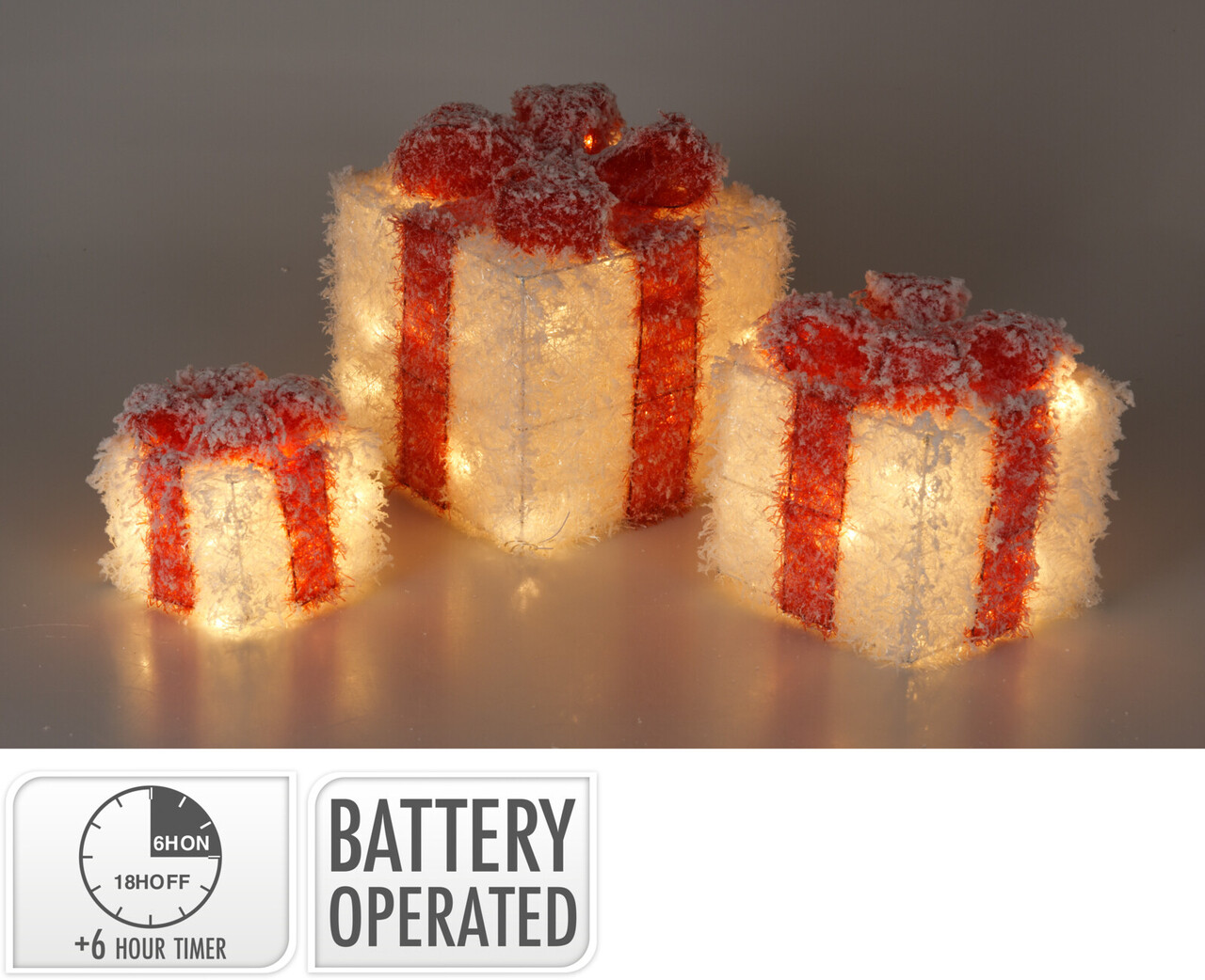 Setul include 3 decoratiuni luminoase cu forma de cadou.