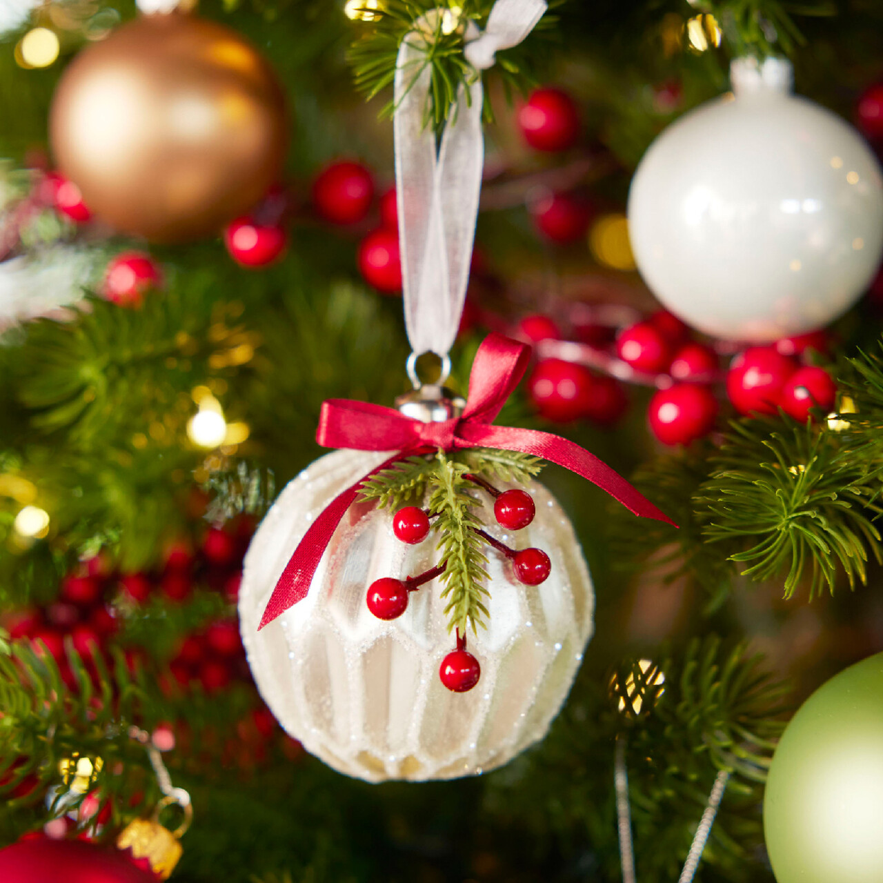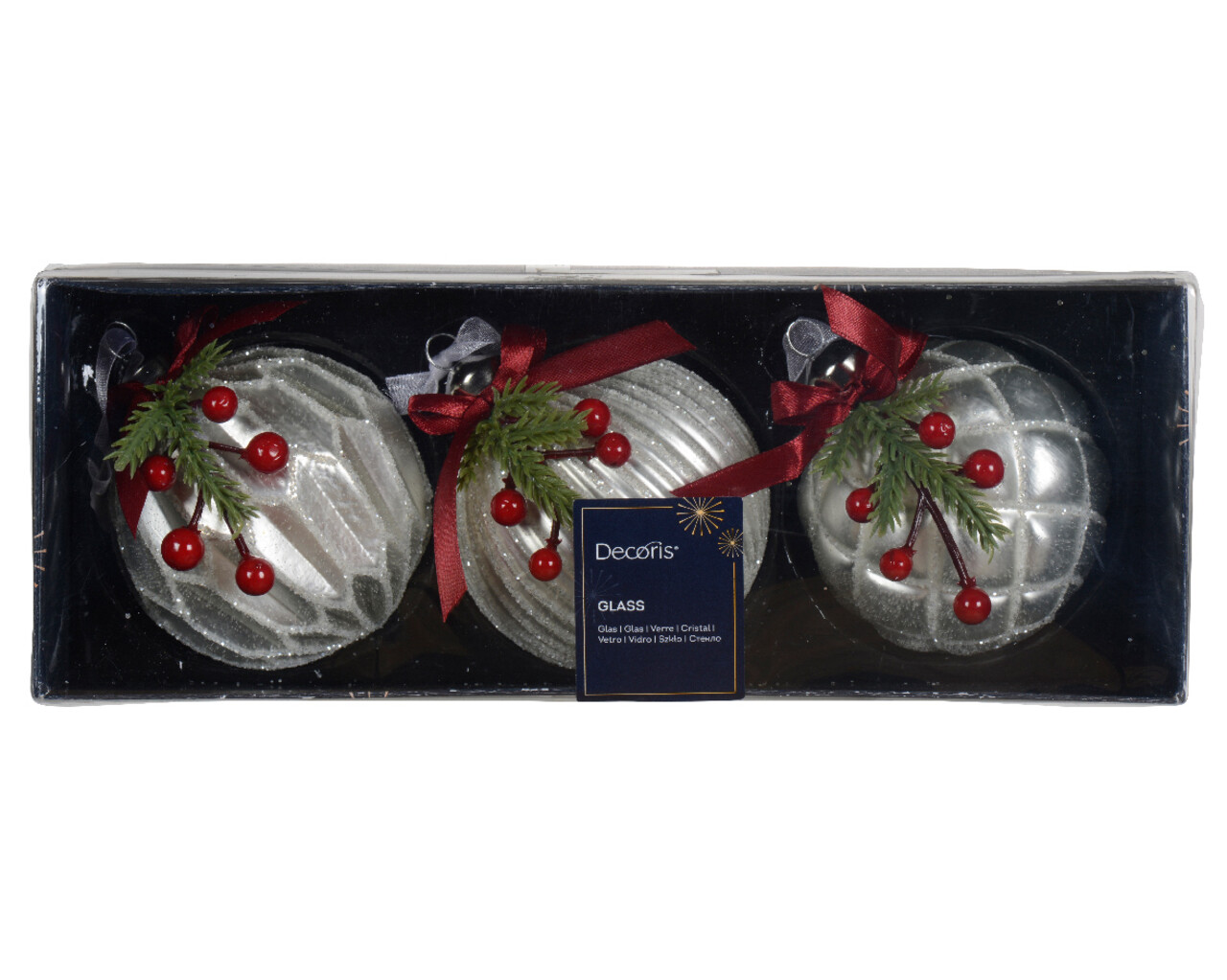Set 3 globuri Snow finish w berries, Decoris, 8 cm, sticla, alb