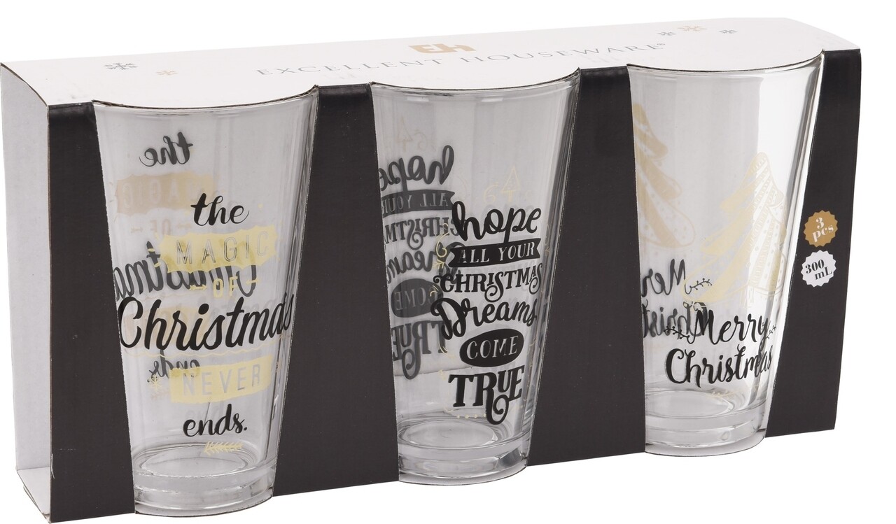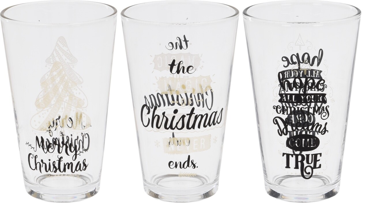 Set 3 pahare Christmas, 300 ml, sticla, negru/galben