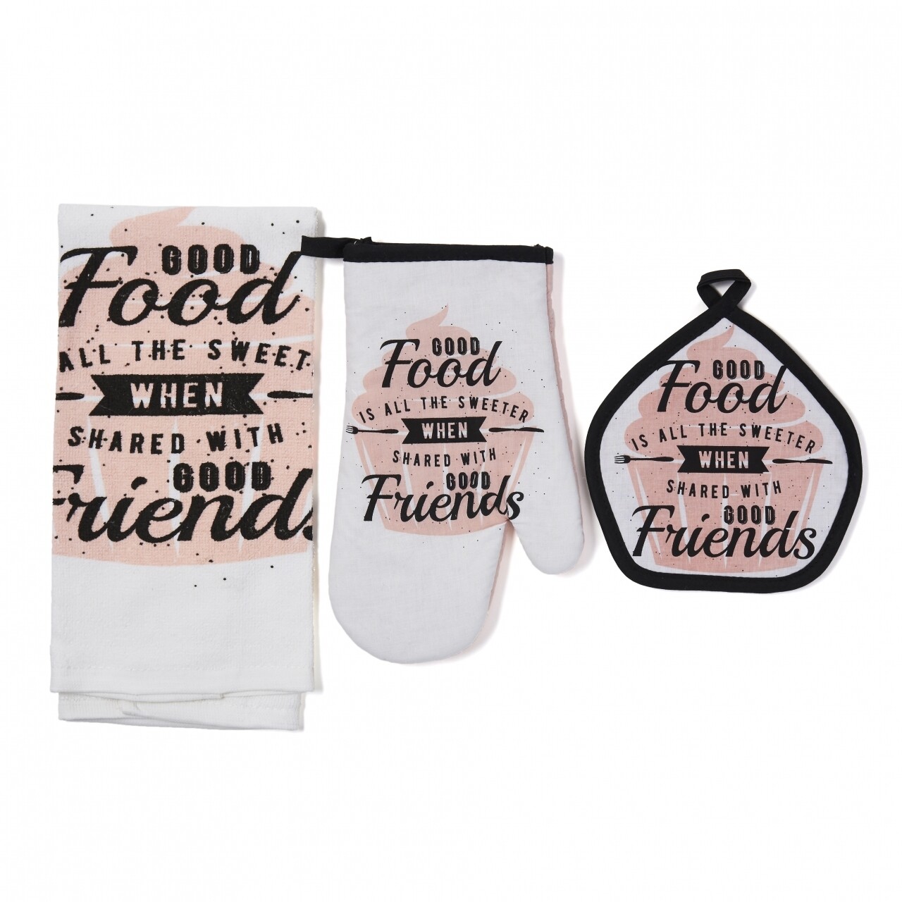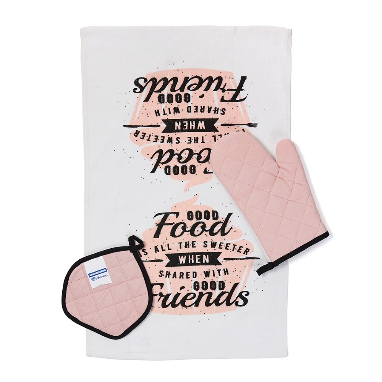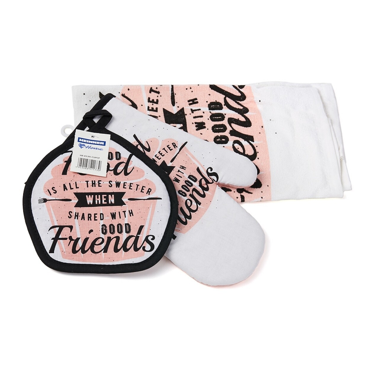 un suport pentru oala (18x18 cm), un prosop de bucatarie (38x63 cm) si o manusa de bucatarie (17x27 cm)