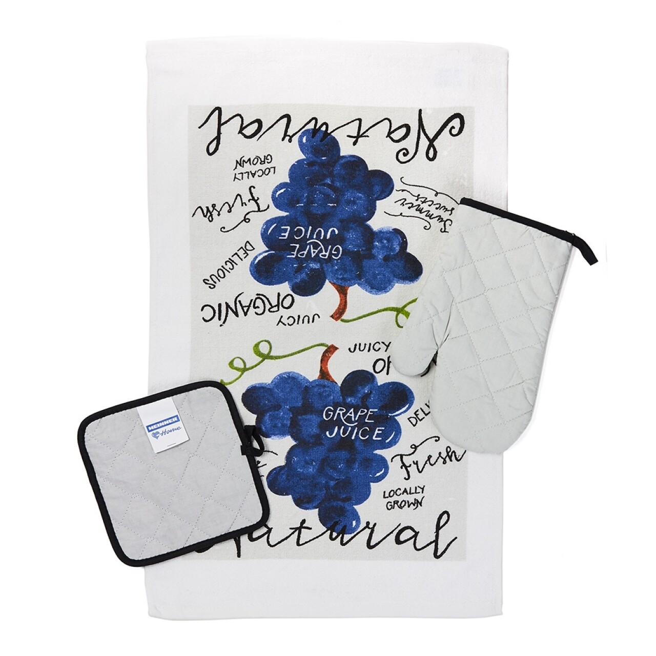 un suport pentru oala (18x18 cm), un prosop de bucatarie (38x63 cm) si o manusa de bucatarie (17x27 cm)
