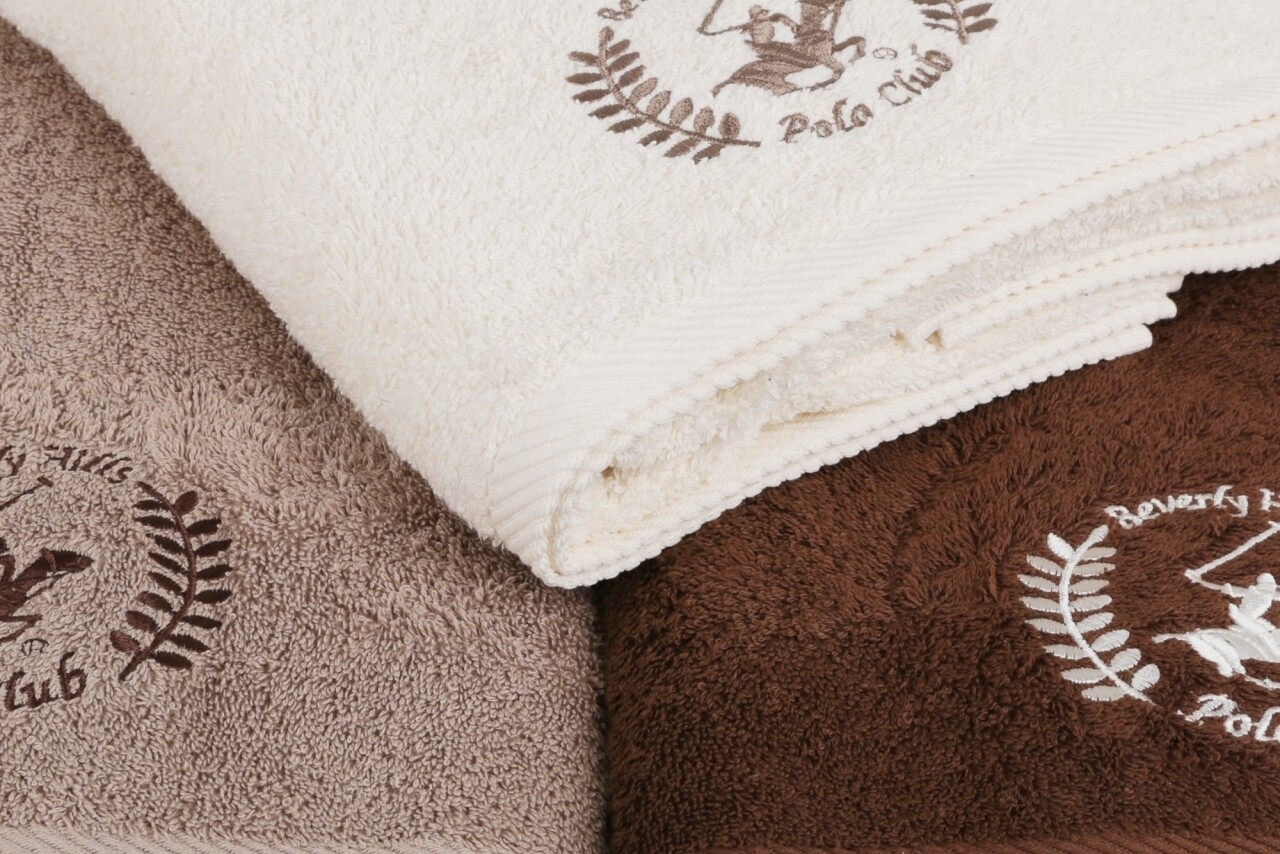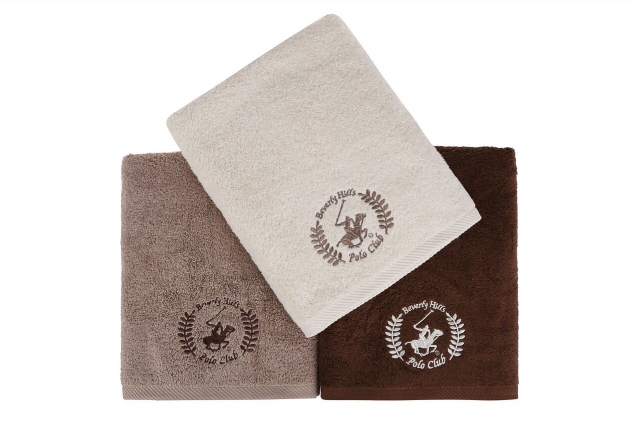 Set 3 prosoape de baie Evolution, Beverly Hills Polo Club, 70 x 140 cm, 100% bumbac, Crem/Maro deschis/Maro inchis