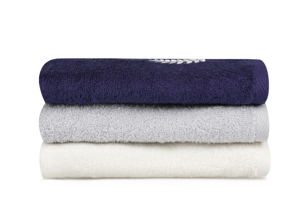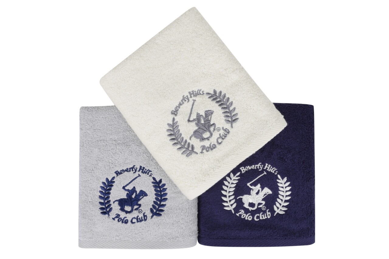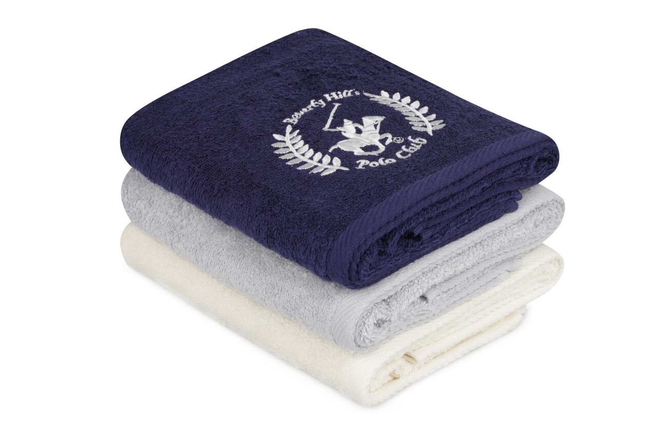 Set 3 prosoape de maini, Beverly Hills Polo Club, 402 - White, Grey, Dark Blue, 50x90 cm, 100% bumbac, alb/gri/bleumarin
