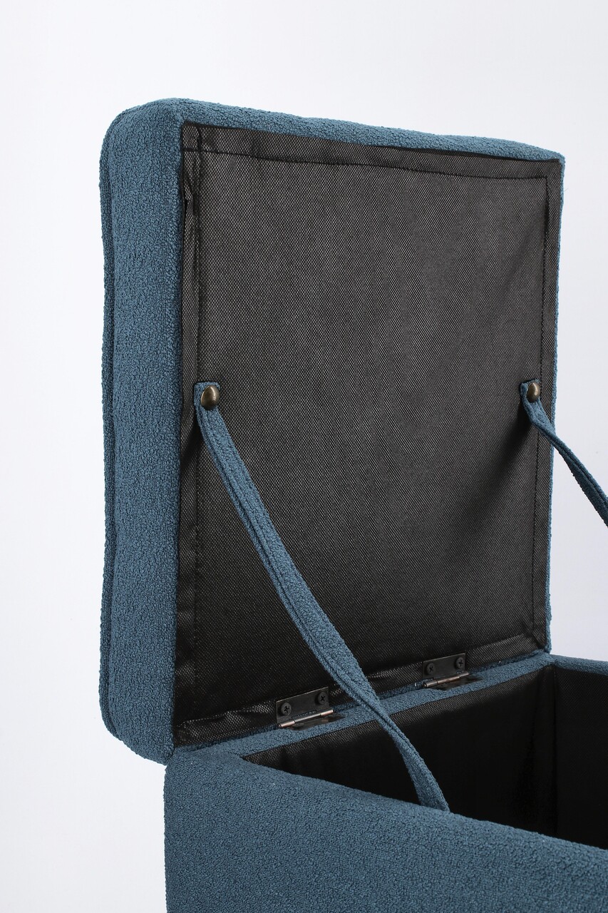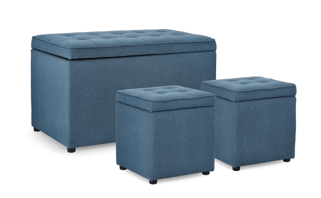 Set 3 taburete cu spatiu de depozitare Derrick, Bizzotto, 40x40x40 cm/89x48x51 cm, lemn de pin/poliester Boucle, albastru