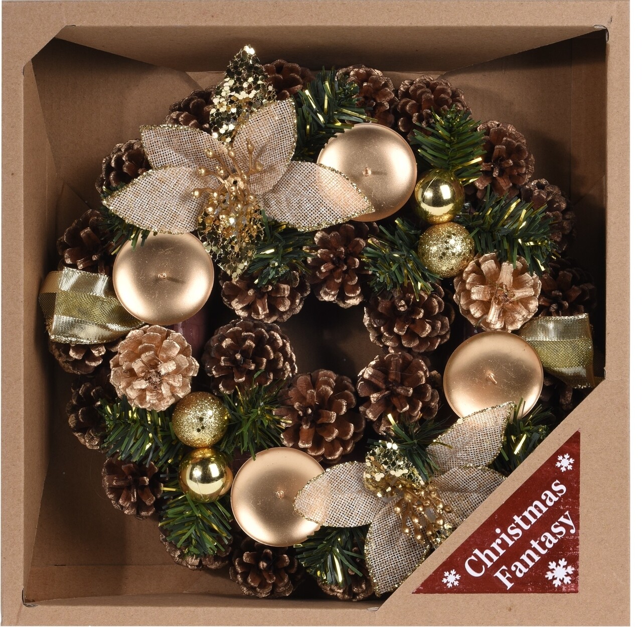 Set 4 lumanari cu suport decorativ Xmas, Ø 28 cm, verde/auriu