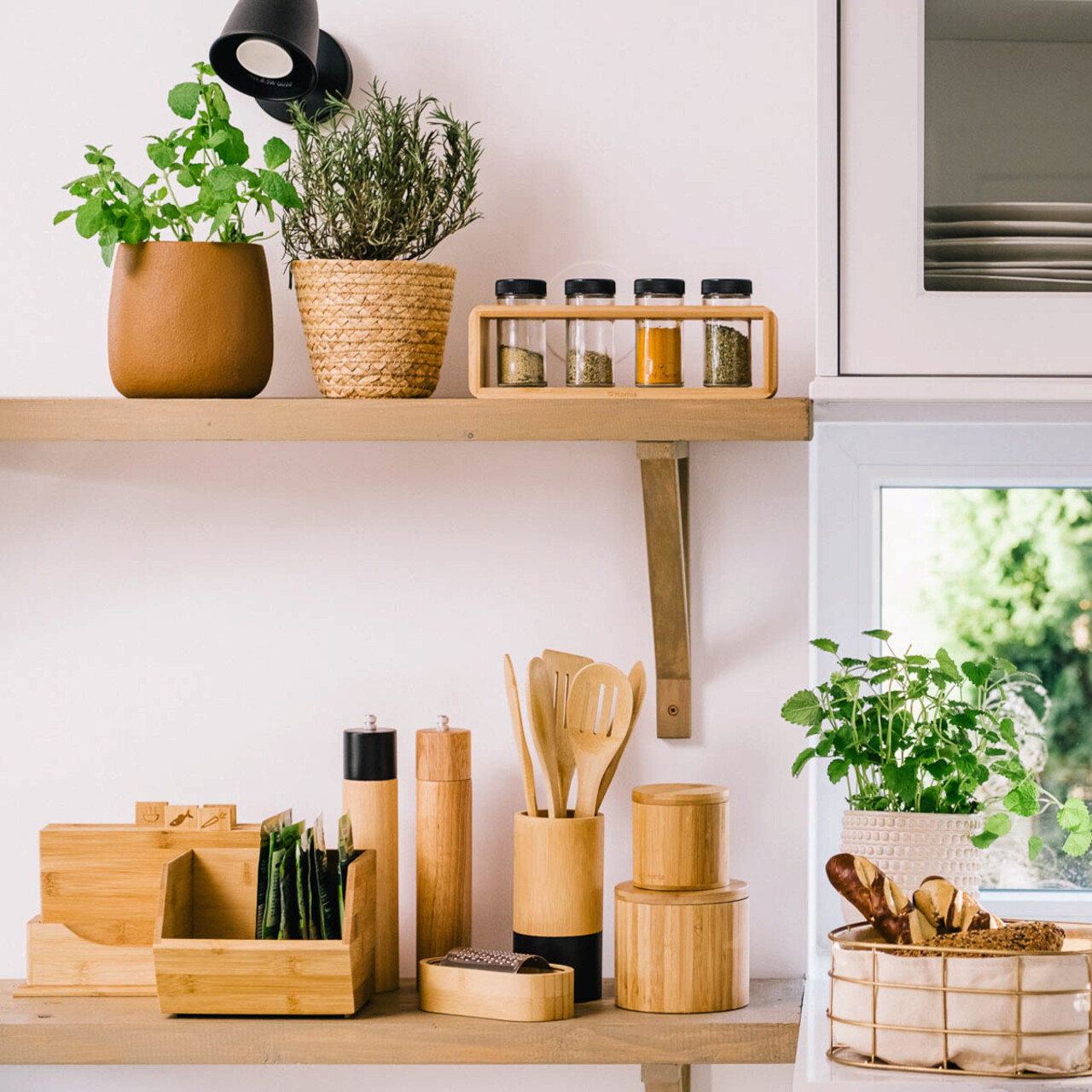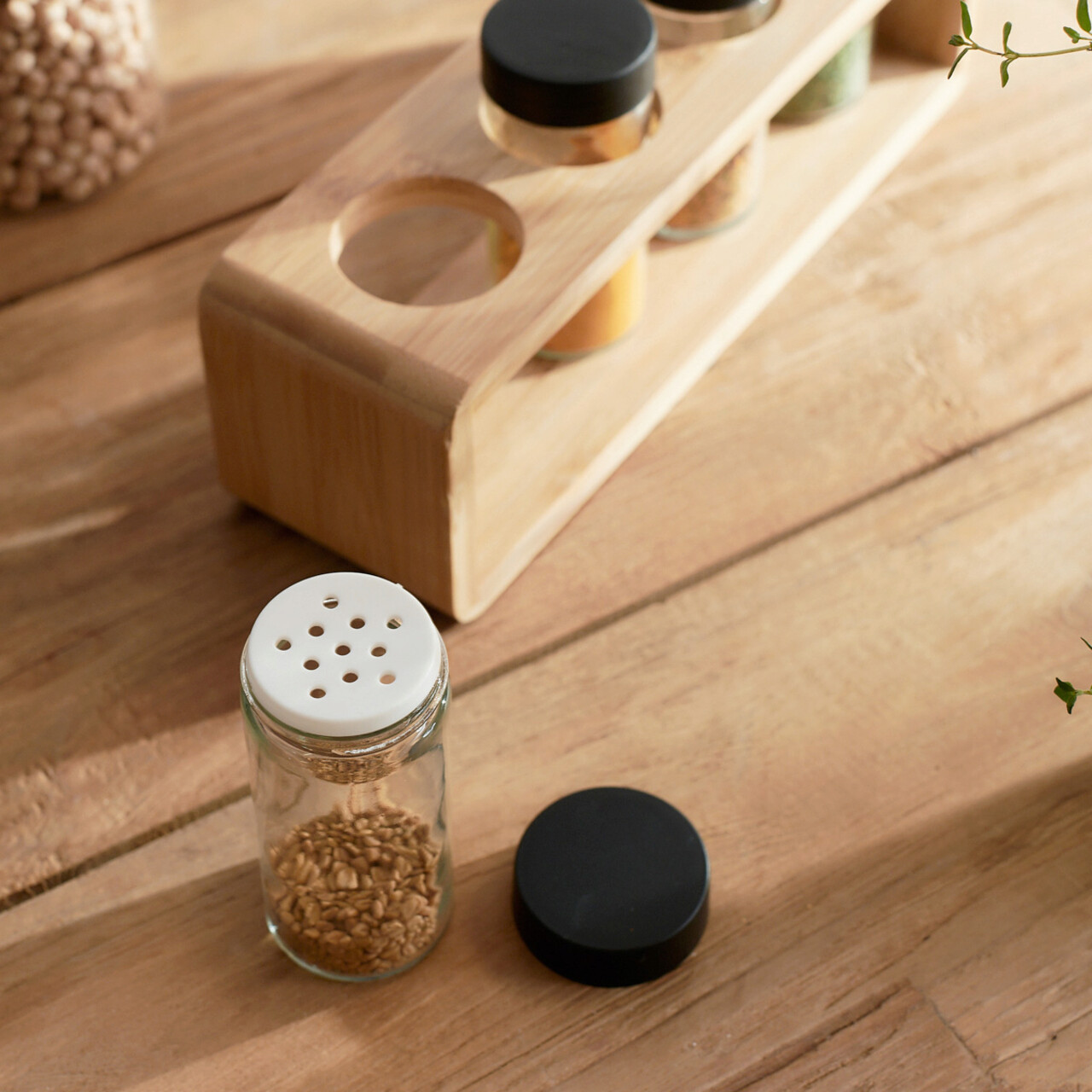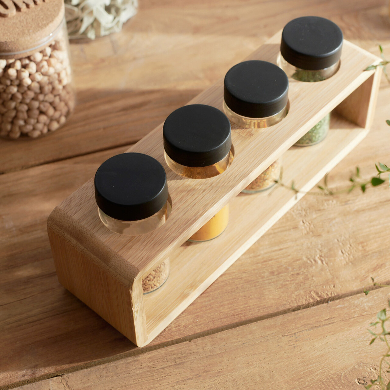 Set 4 recipiente pentru condimente si suport Bambou, Homla, 26x7.5 cm, bambus, natur/negru