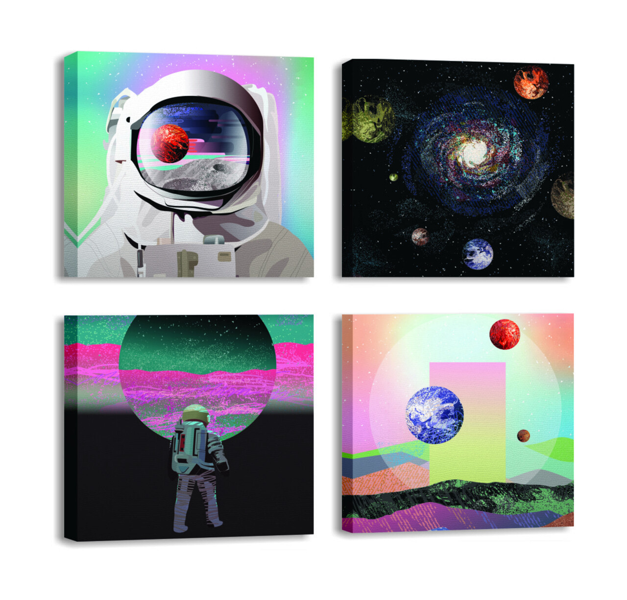 Set 4 tablouri decorative, FRJ12, 60% bumbac/40% poliester, Rama de lemn, Multicolor