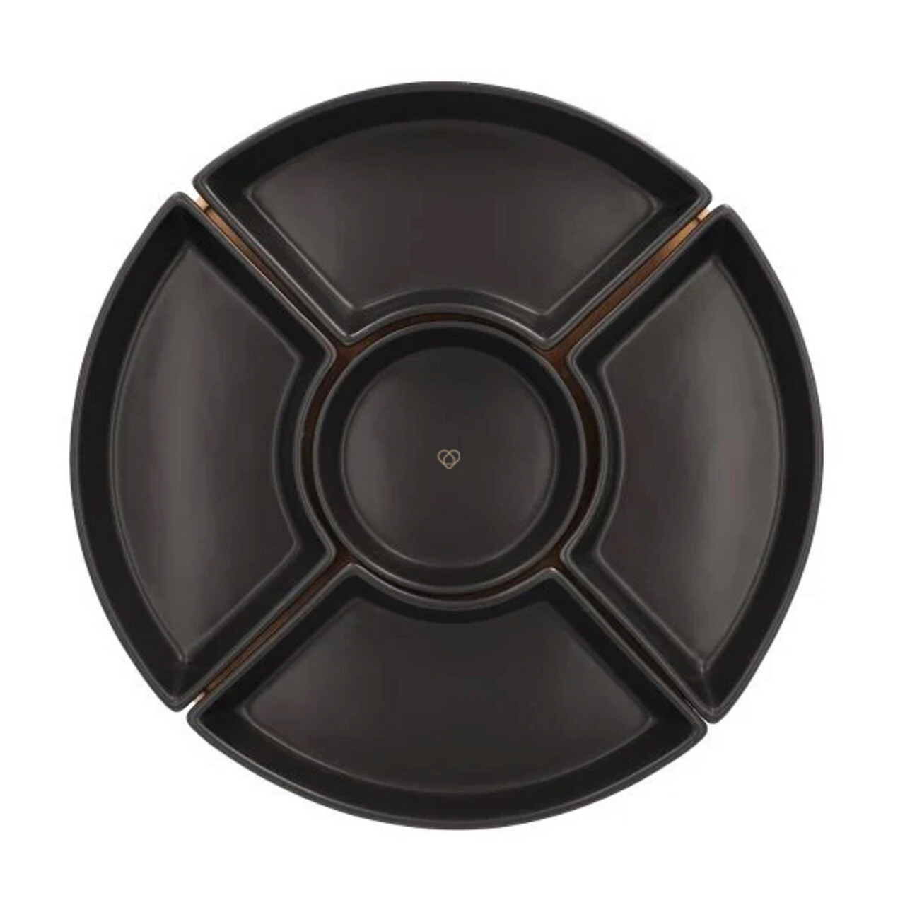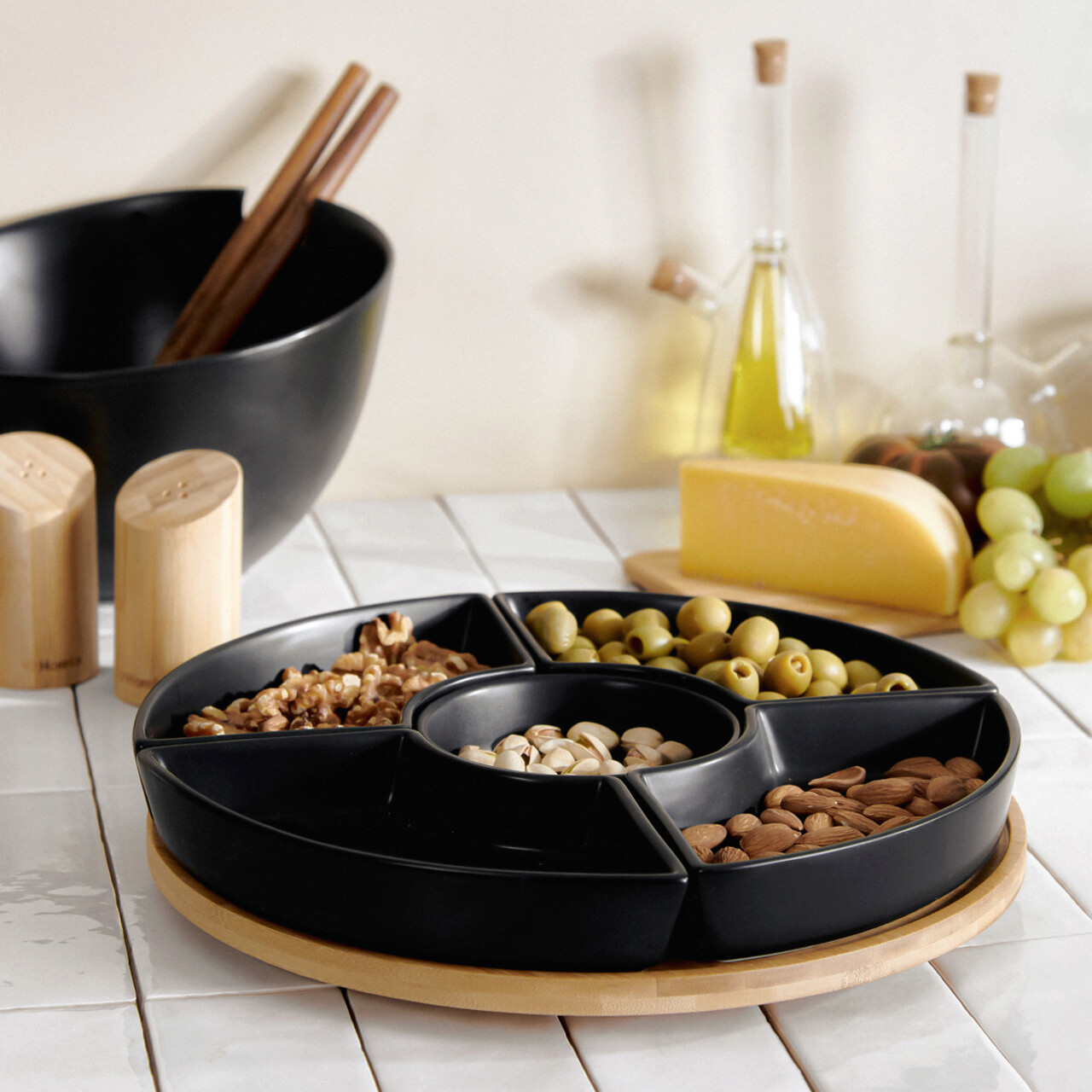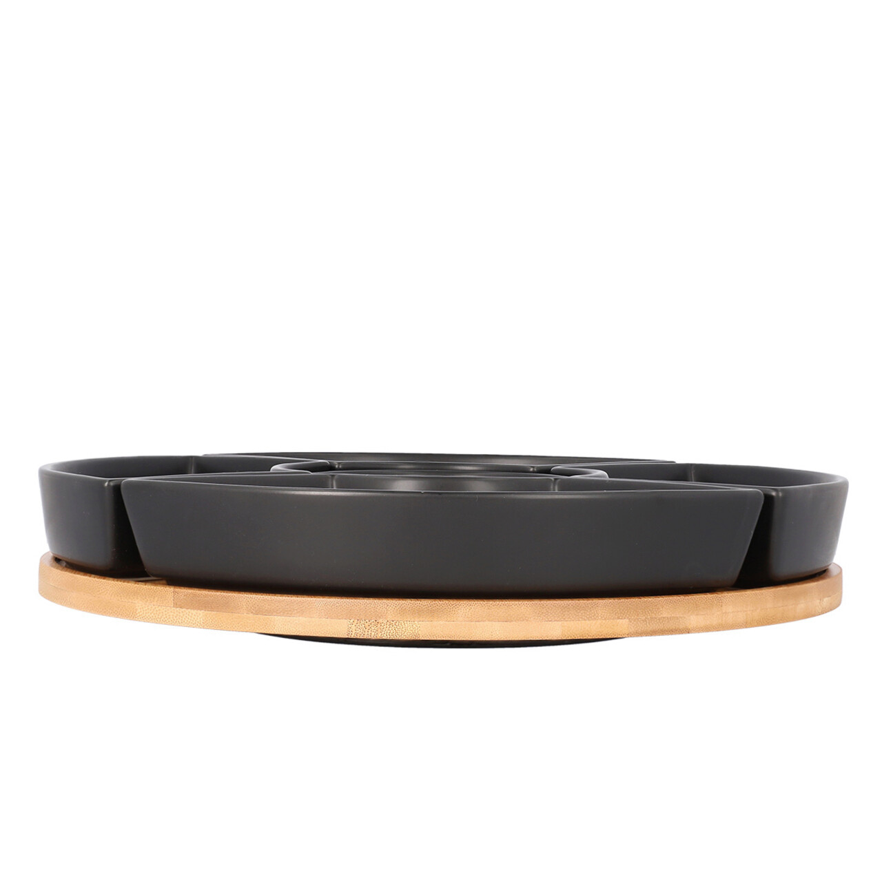 Set 5 boluri pentru servire cu suport Fincan, Homla, 30 cm, portelan/lemn, negru/natur