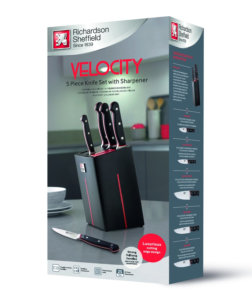 Acest set robust combina design-ul exceptional cu multifunctionalitatea. Cutitele Velocity au manere negre cu trei nituri si un accent rosu subtil pe marginea dintre maner si lama. Lama este fabricata din otel inoxidabil de inalta calitate. Blocul de cutit din lemn are un strat negru profund si linii rosii decorative. Datorita design-ului sau elegant, blocul se potriveste cel mai bine intr-o bucatarie moderna, cu linii curate. Blocul sta ferm pe blat deoarece este usor inclinat, dispozitivul de ascutit incorporat poate fi usor utilizat intr-o singura miscare.