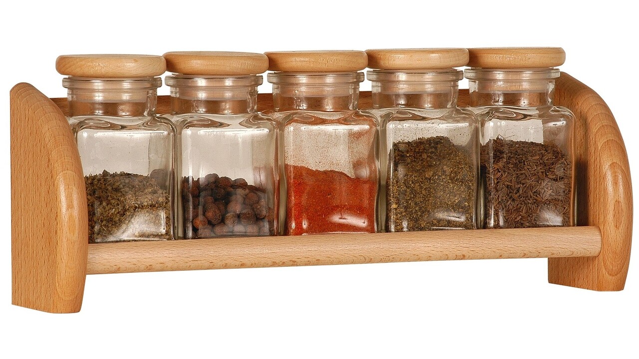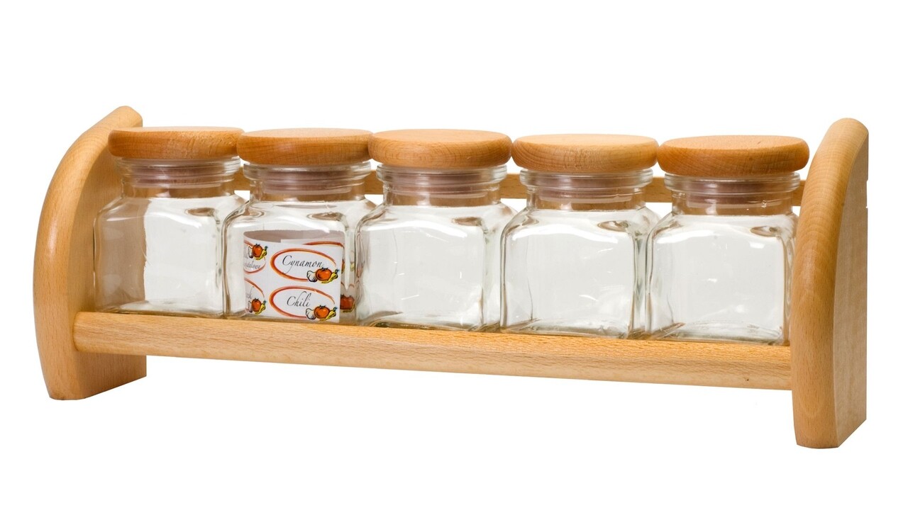 Set 5 recipiente pentru condimente si suport lemn, President, Practic