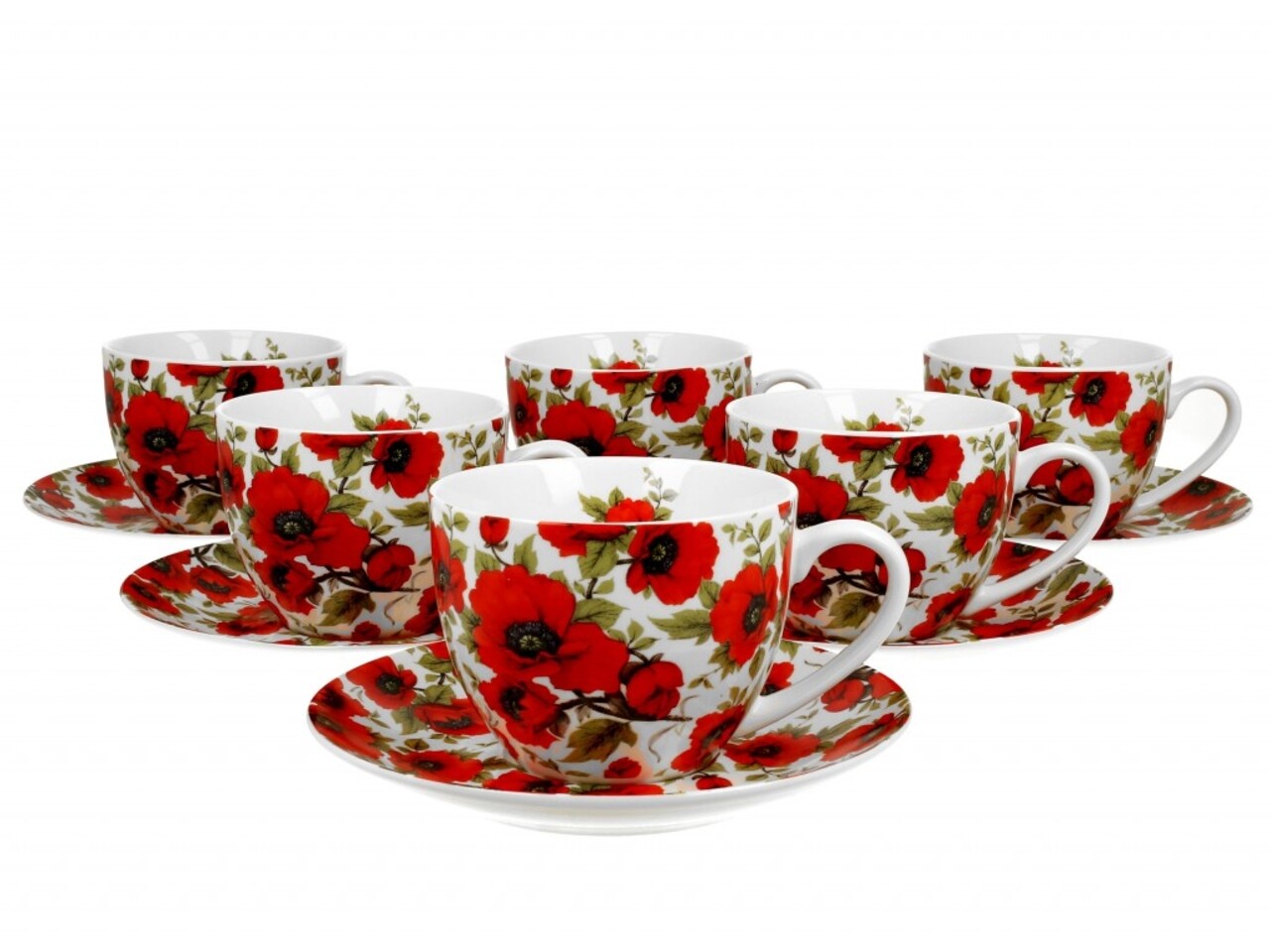 Set 6 cesti cu farfurioara, Duo, Lina, portelan, rosu