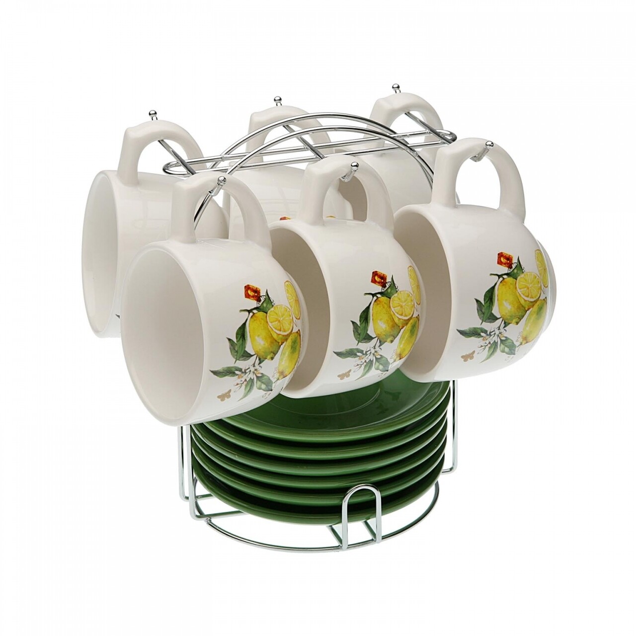 Set 6 cesti cu farfurioare pentru ceai, Versa, 200 ml, portelan, verde/galben