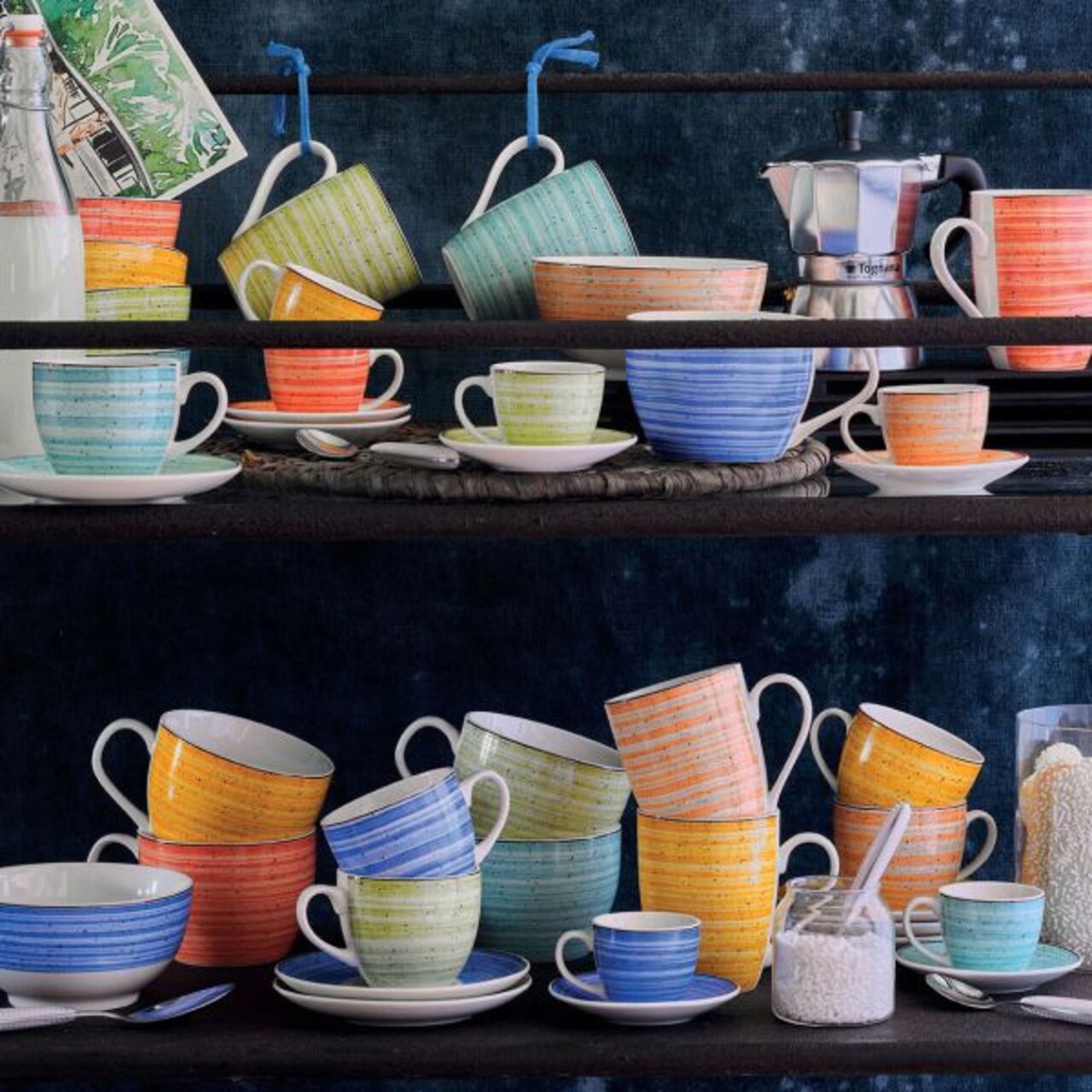 Set 6 cesti de cafea cu farfurie Iris Kaleido, Tognana Porcellane, 80 ml, portelan New Bone China, multicolor