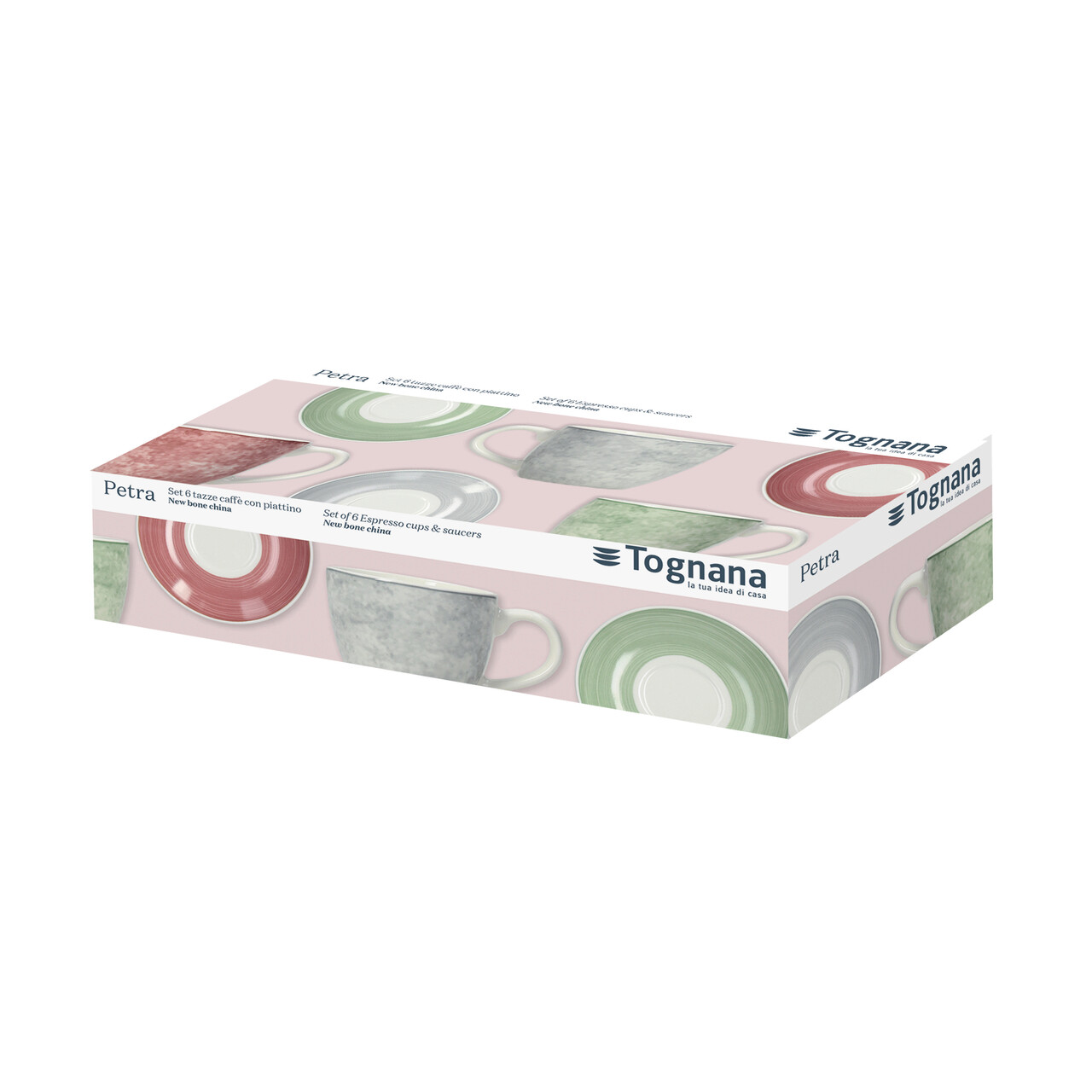 Set 6 cesti de cafea cu farfurie Iris Petra, Tognana Porcellane, 80 ml, portelan New Bone China, multicolor
