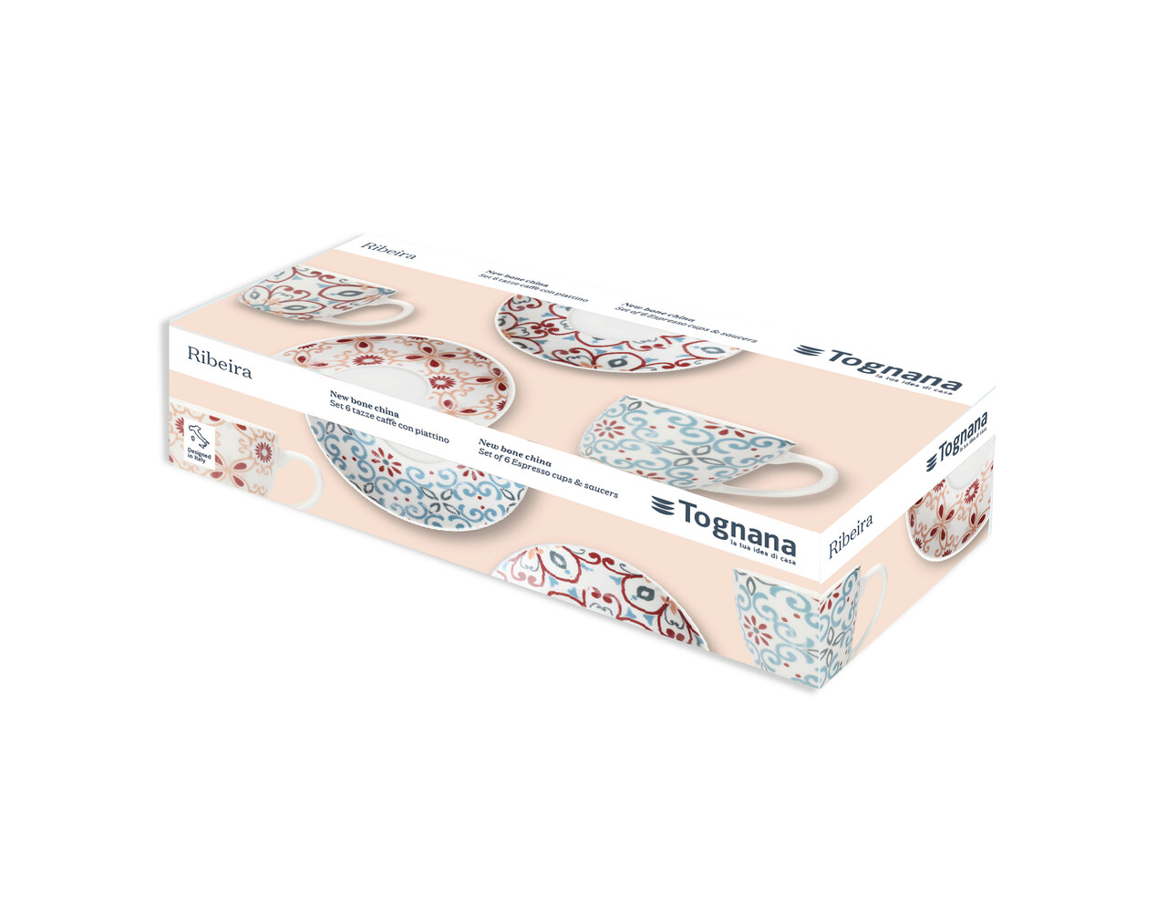 Set 6 cesti de cafea cu farfurie Iris Ribeira, Tognana Porcellane, 80 ml, portelan New Bone China, multicolor