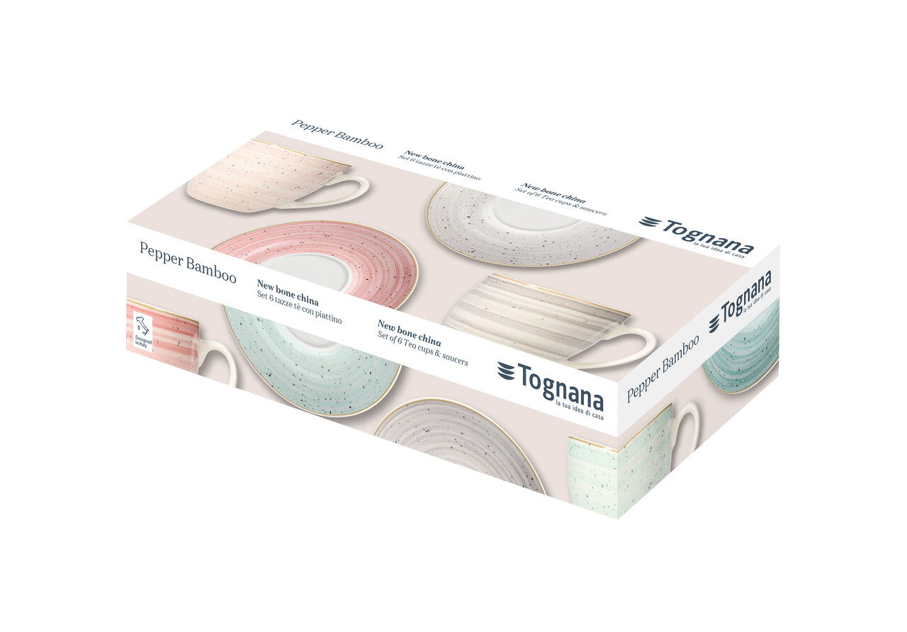 Set 6 cesti de ceai cu farfurie Iris Pepper, Tognana Porcellane, 200 ml, portelan New Bone China, multicolor