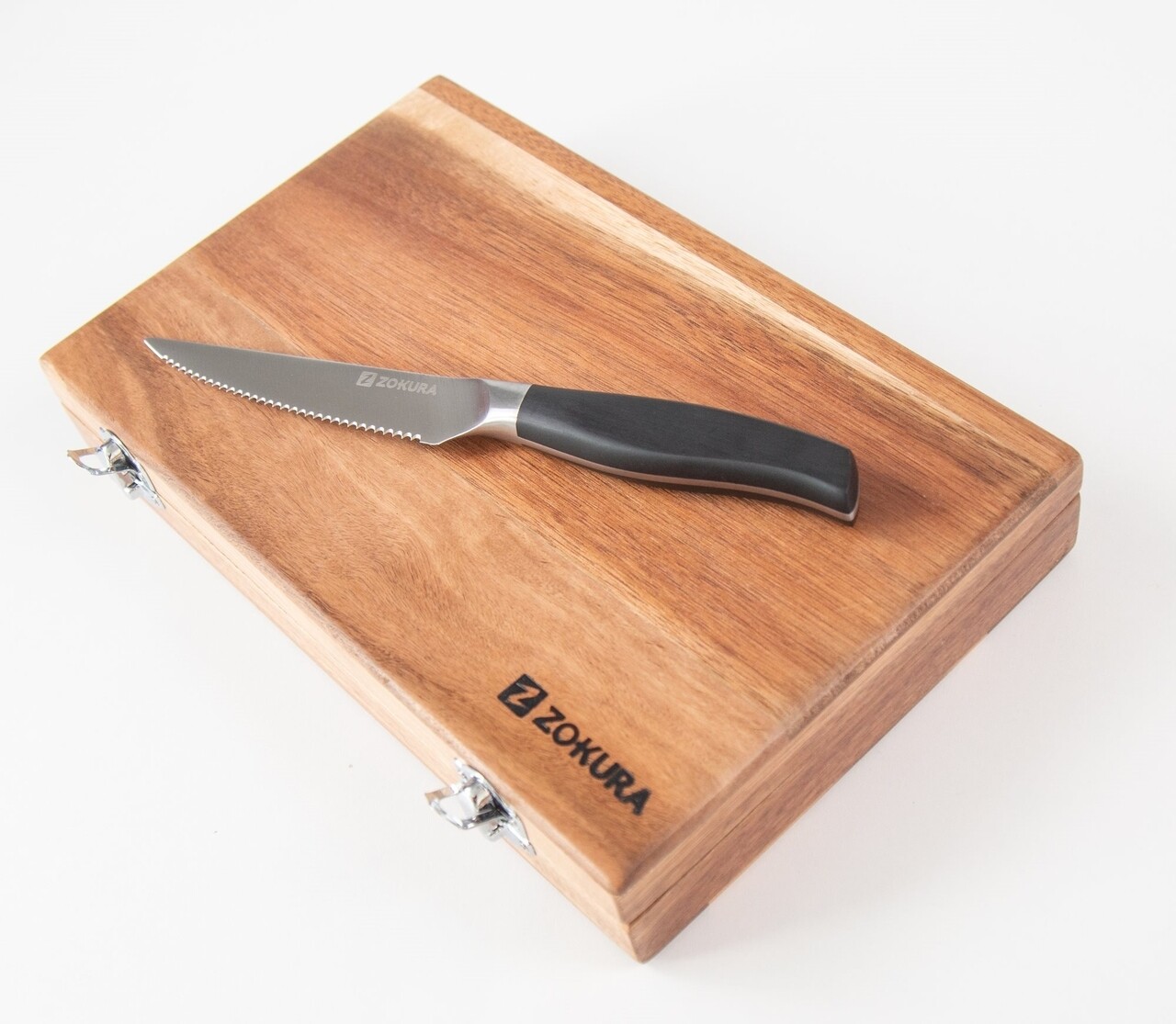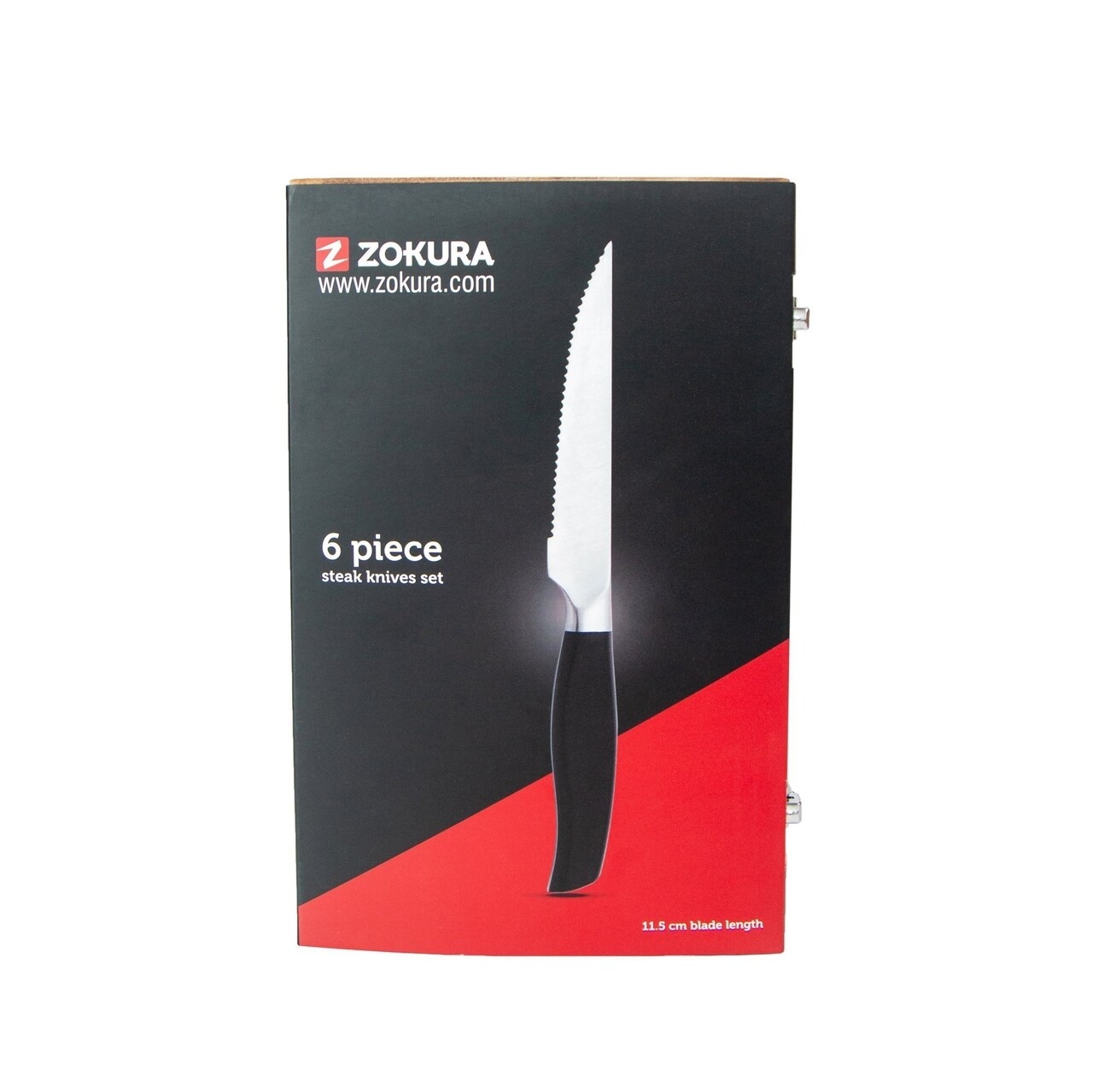 Set 6 cutite pentru friptura si cutie depozitare din lemn, marca ZOKURA, fabricate din inox rezistent la coroziune.