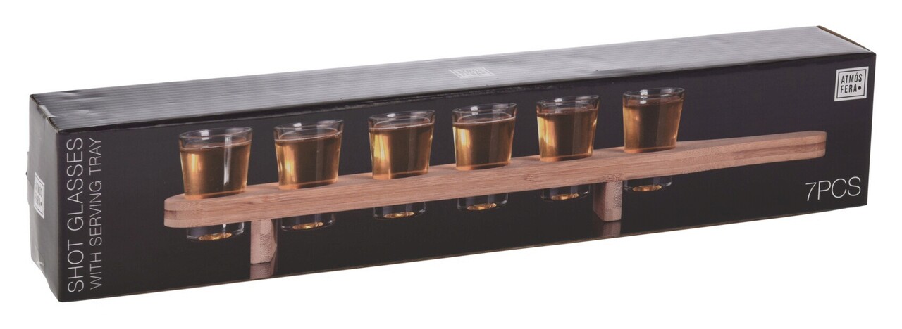 Set 6 pahare pentru shoturi si suport servire, 40 ml, 43 cm, sticla/lemn