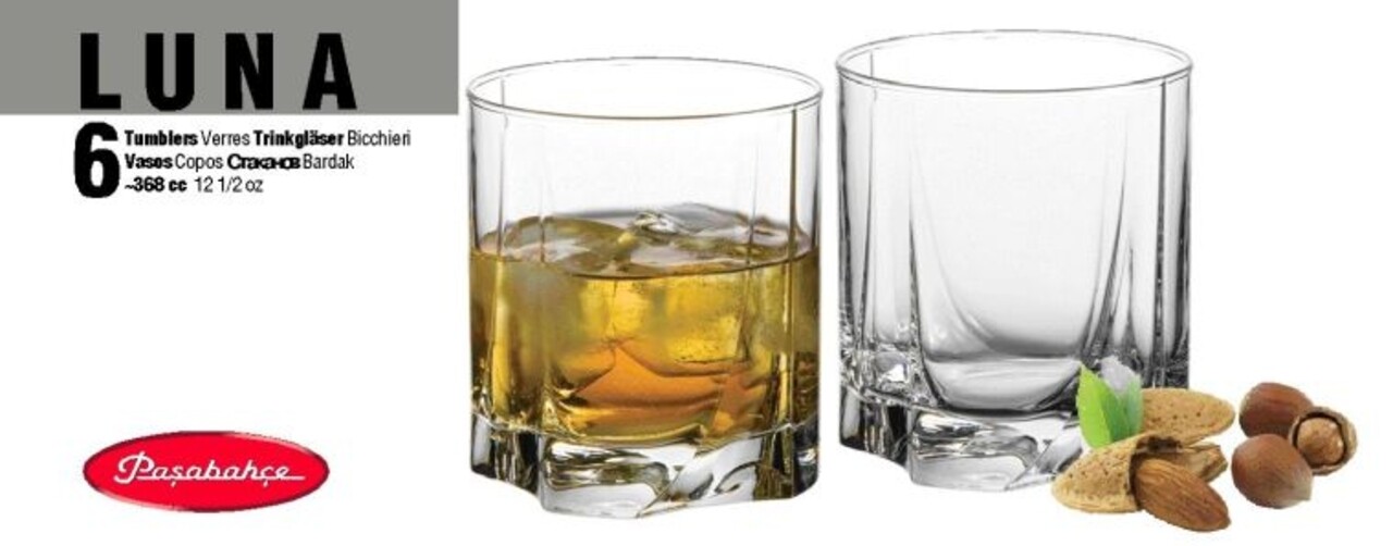 Set 6 pahare whisky Luna, Pasabahce, 368 ml, sticla, transparent