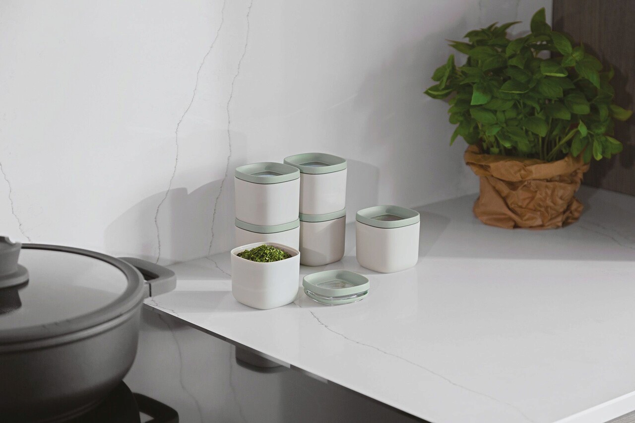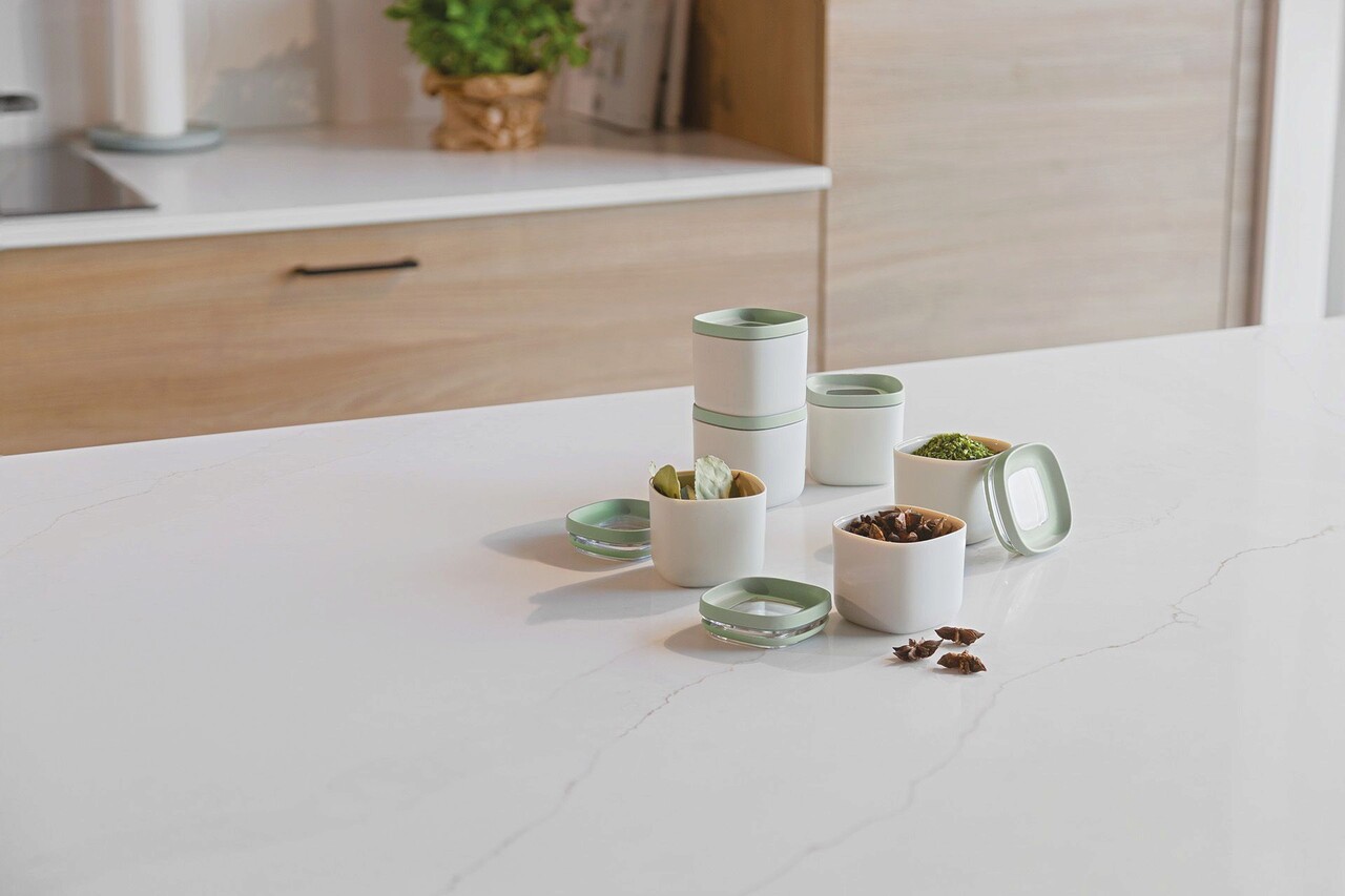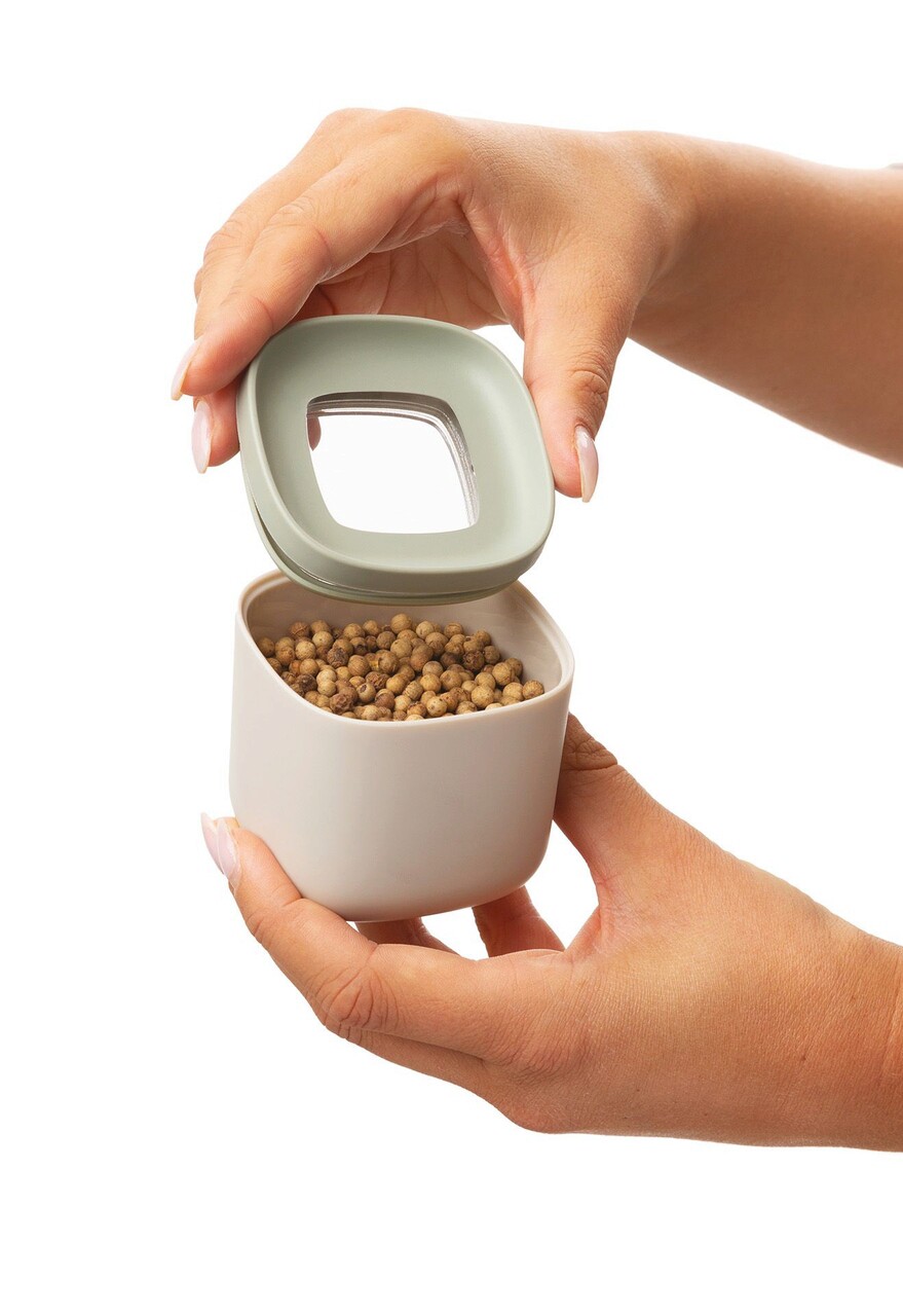Condimente, bomboane, biscuiti, faina,... pastrati totul proaspat si gustos cu putin ajutor din partea acestor recipiente stivuibile pentru alimente. Setul mare de recipiente cu 2 bucati poate fi extins cu setul nostru de recipiente mici pentru alimente si condimente cu 6 bucati. Deschiderea mare garanteaza accesul usor la continutul recipientului. In plus, recipientele sunt stivuibile si sunt concepute in forma patrata pentru o economie optima de spatiu. Recipientele sunt antiderapante si pot fi spalate in masina de spalat vase, astfel incat curatarea lor este floare la ureche! Datorita ferestrei transparente din partea superioara puteti verifica continutul in orice moment. Cu gandul la viitor, recipientele noastre sunt fabricate din plastic reciclat pentru o experienta de gatit mai ecologica si mai sustenabila. Bucurati-va de gatit si condimentati lucrurile cu setul nostru practic de recipiente pentru alimente! Setul include 6 recipiente cu dimensiunile 6,93 cm × 6,93 cm × 6,6 cm, 160 ml.