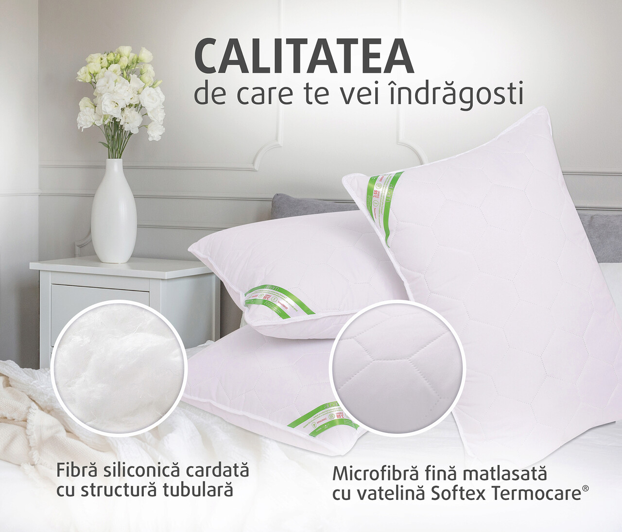 Husa hipoalergenica, confectionata din microfibra fina matlasata cu vatelina Softex Termocare, imbunatateste confortul si asigura reglarea temperaturii corpului in timpul somnului prin ventilatia excelenta datorata fibrelor cu structura aerata.