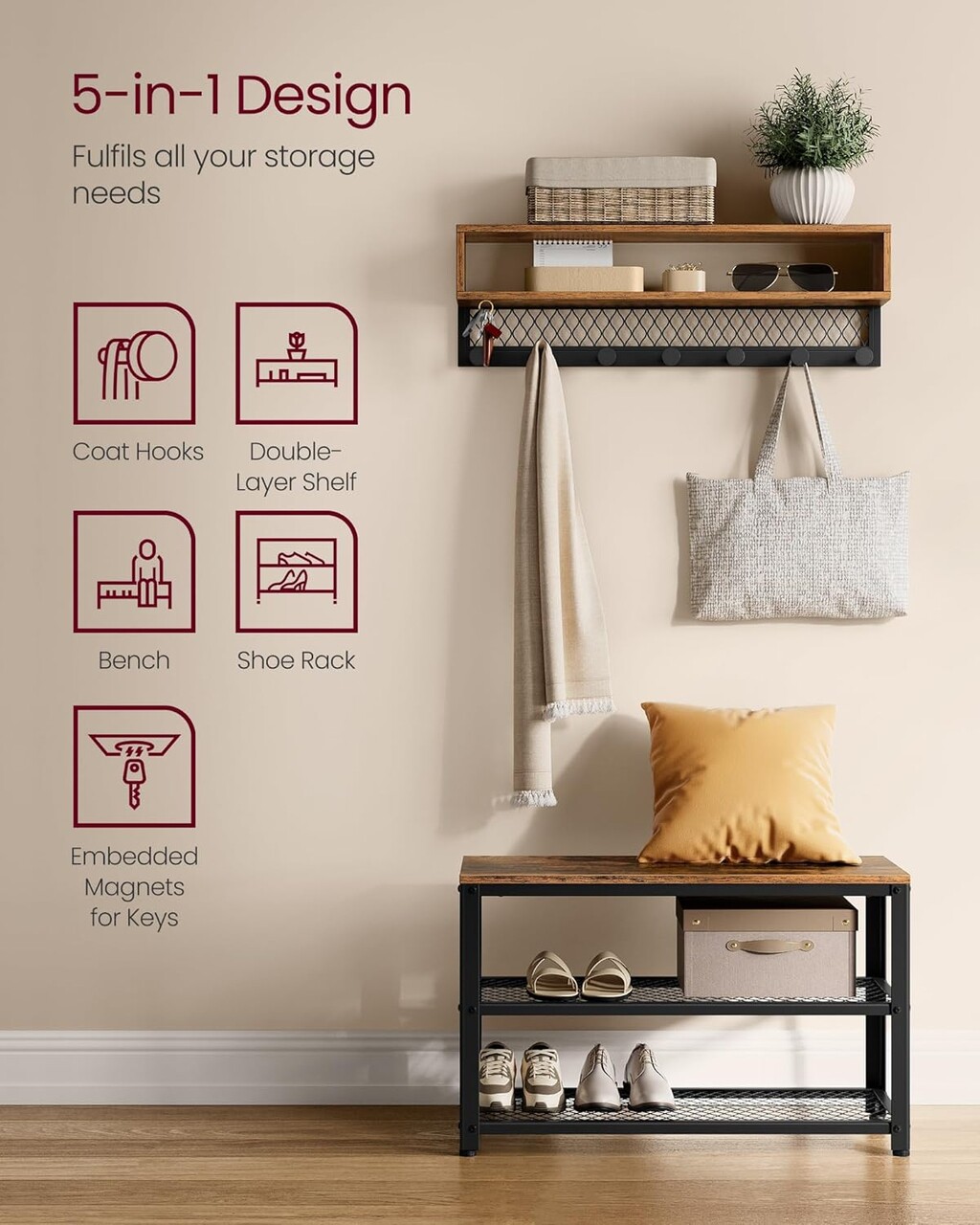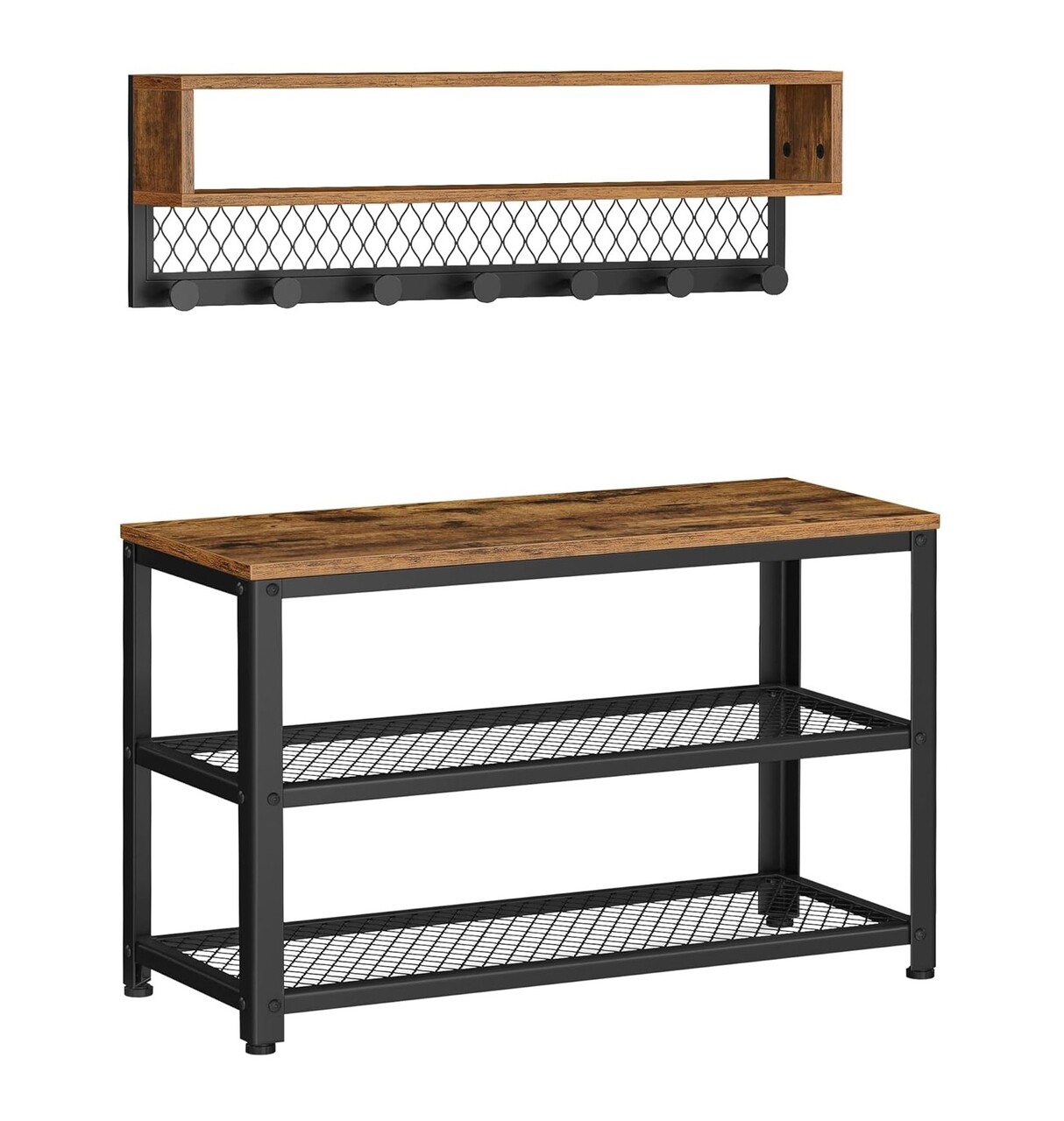 Set bancheta cu pantofar si cuier de perete, Vasagle, 73x30x45 cm/75.1x12.5x22 cm, PAL/otel, maro rustic