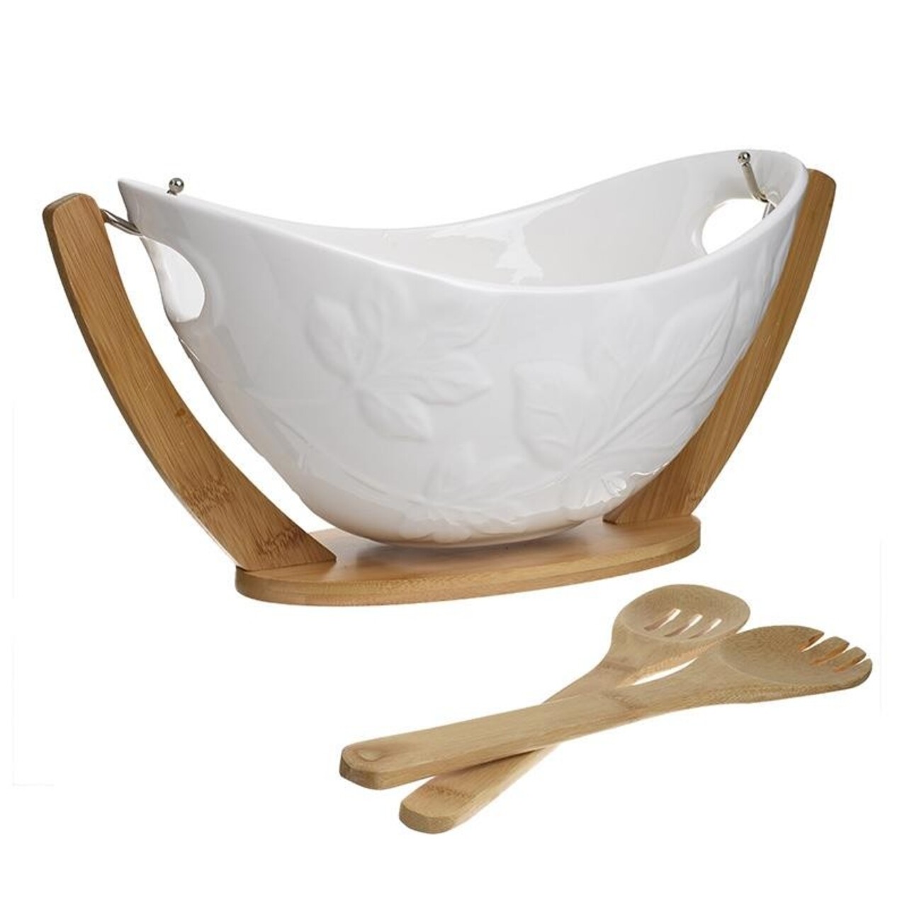Set bol pentru salata si accesorii InArt, portelan, bambus, alb/maro