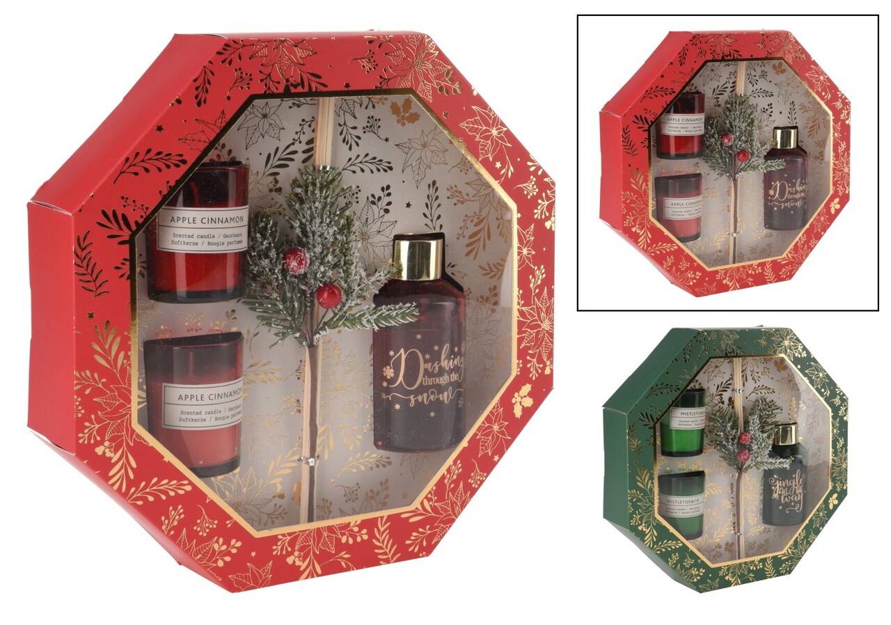 Set cadou aromaterapie Apple Cinnamon, 2 lumanari parfumate si difuzor cu betisoare, aroma mar/scortisoara, rosu