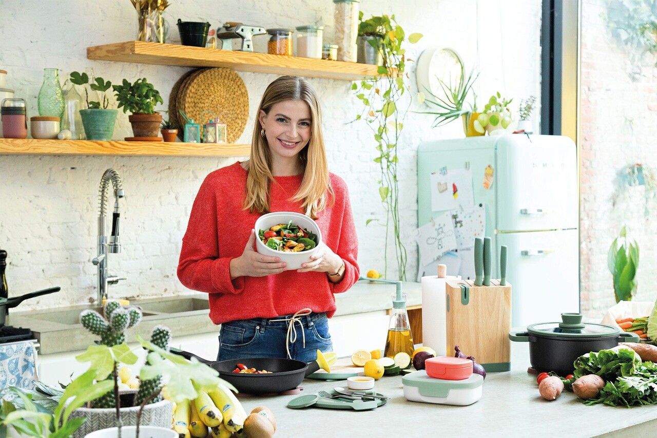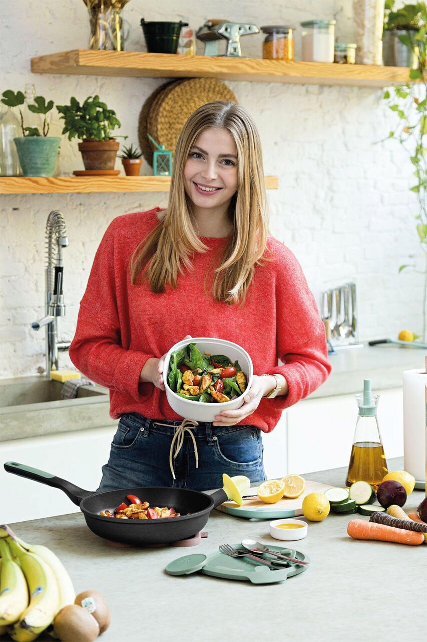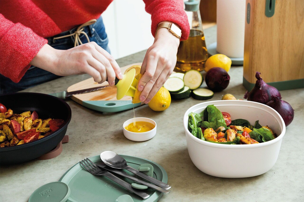 O salata greceasca, o salata Caesar sau o salata de fructe, indiferent de felul de mancare sanatoasa pe care o pregatiti, va avea un gust grozav in acest bol de salata elegant. Gata cu ingredientele imbibate datorita recipientului integrat pentru sos. Doar amestecati toate ingredientele preferate si consumati-le direct cu setul de tacamuri din dotare. Compozitie: polipropilena, otel inoxidabil18/10, capac din polipropilena cu margine din cauciuc TPE.