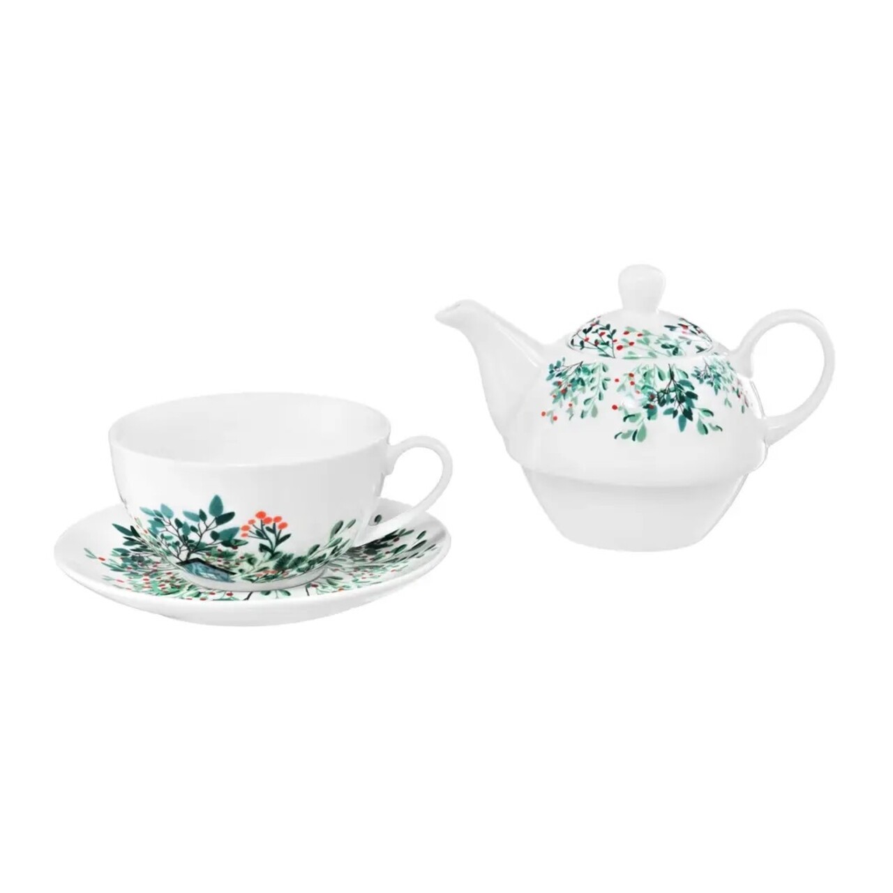 Set ceai pentru o persoana, ceainic cu ceasca si farfurie Greenery, Ambition, 240/370 ml, portelan