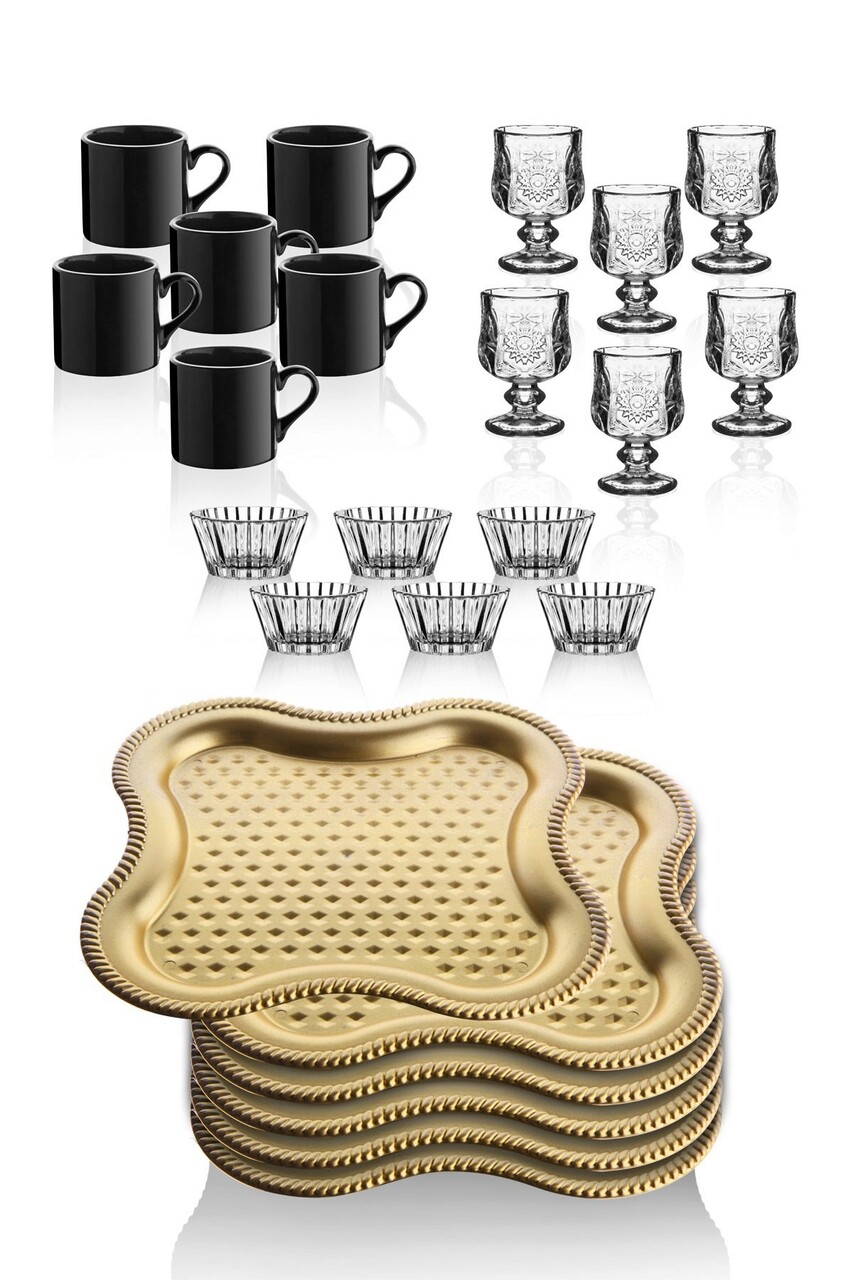 Set cesti de cafea, Rowe, 196RWE2521, Plastic, + 6 tavi servire 21 x 21 cm, Auriu