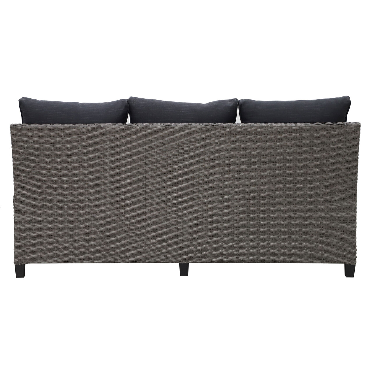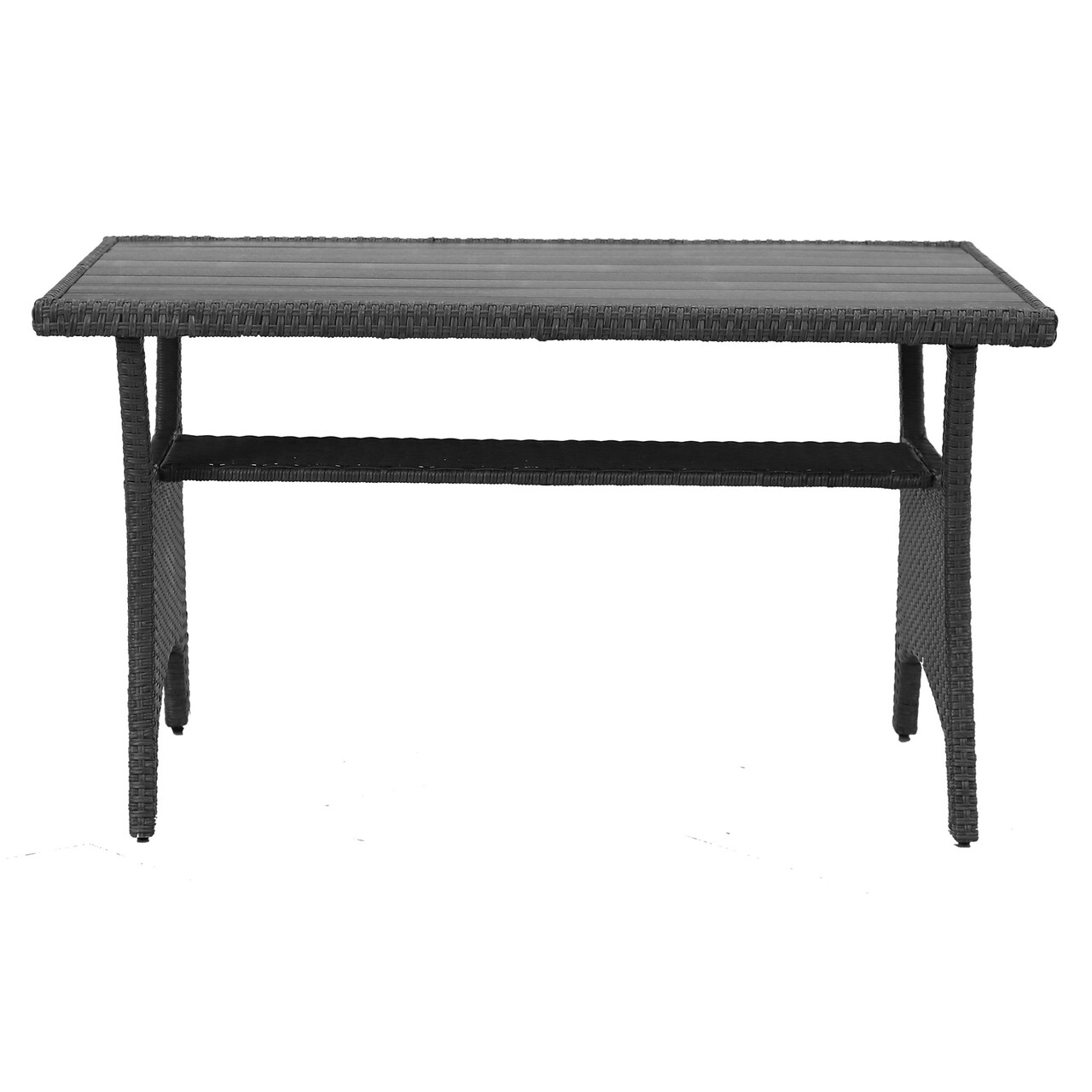 Realizat din structura de otel vopsita in camp electrostatic si impletita cu fibre sintetice tratate UV ce imita ratanul. Include perne din poliester 230 g cu protectie impotriva umezelii si a decolorarii. Husele sunt prevazute cu fermoar pentru a fi mai usor de indepartat si curatat. Topul mesei este realizat din imitatie lemn.