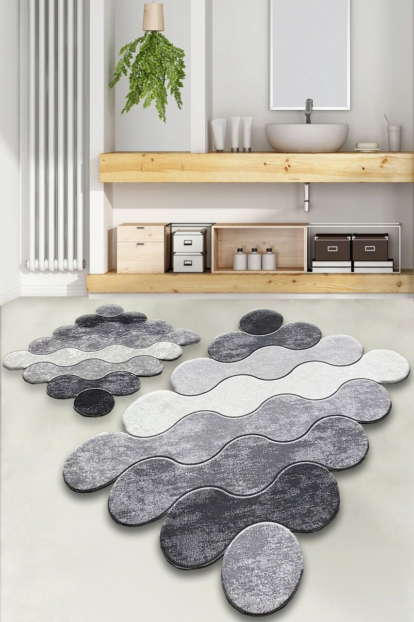 Set covorase de baie 2 piese, Chilai, Circle, Poliester, Gri / Gri deschis / Alb