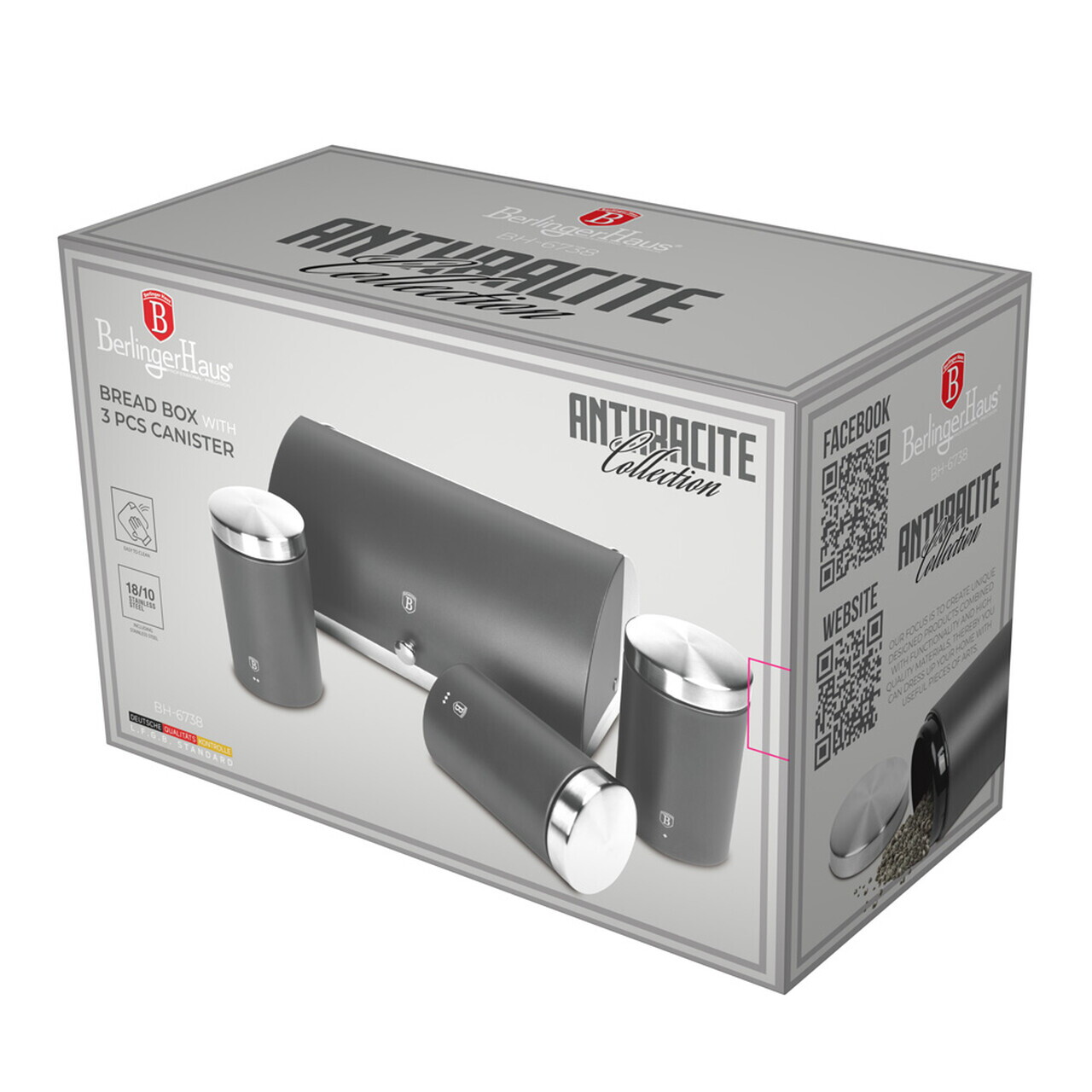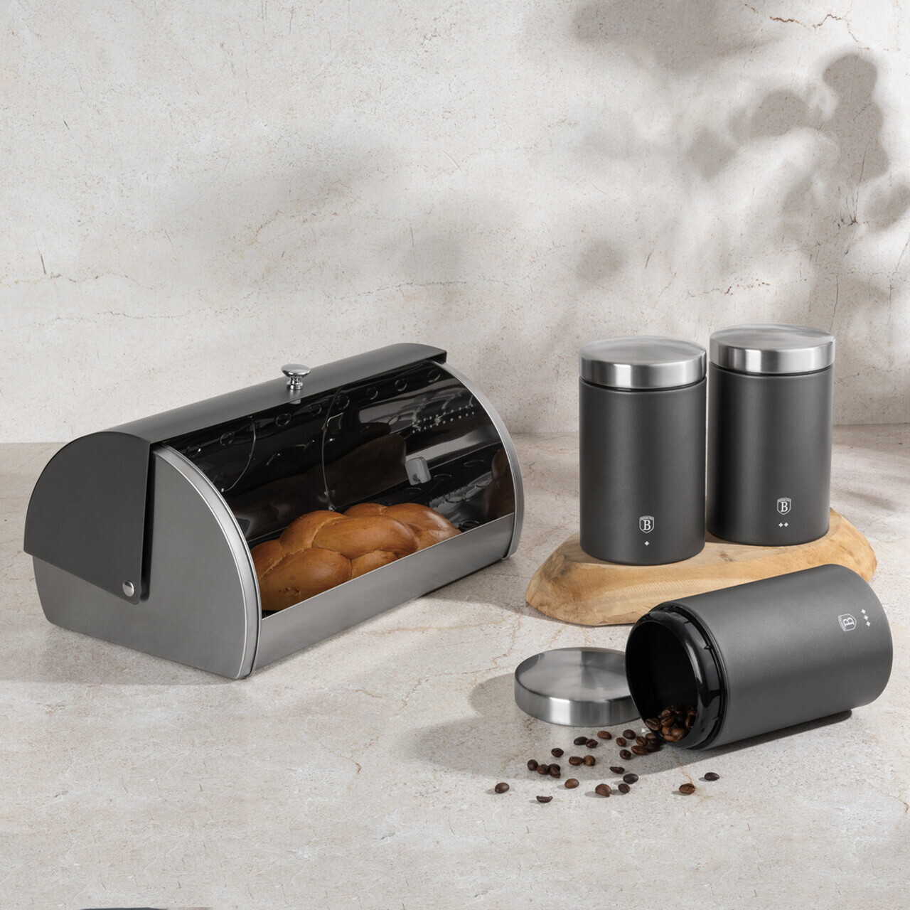 Set cutie pentru paine si 3 recipiente Berlinger Haus, Anthracite, 38.5x28x18.5 cm, inox, antracit mat/argintiu