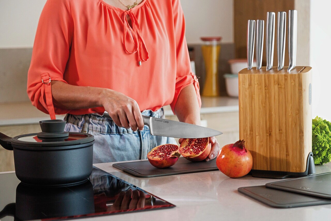 Acest set de 3 piese include un cutit de curatat, un cutit utilitar si un cutit de bucatar, setul de cutite perfect pentru inceput in bucataria dvs. Cutitul de bucatar multifunctional este destinat felierii si taierii in cubulete, cutitul utilitar taie curate alimentele cu un exterior dur si un interior moale, iar cutitul de bucatarie se ocupa de toate lucrarile de taiere la scara mica. Compozitie material: otel inoxidabil X30Cr13.
