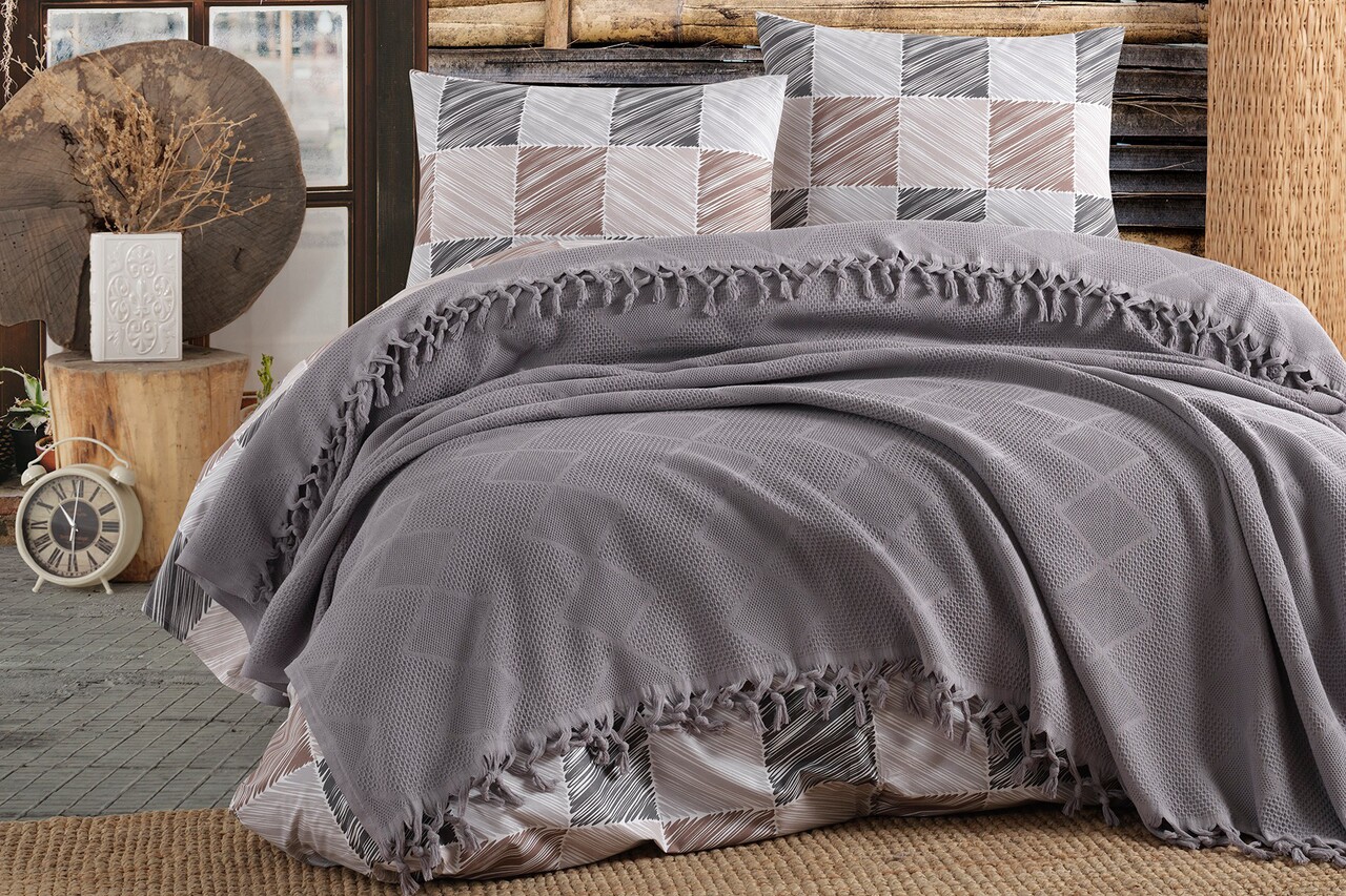 Set cuvertura de pat dubla Pique, 4 piese, 220x240 cm, 100% bumbac, Saheser, Mona, gri inchis