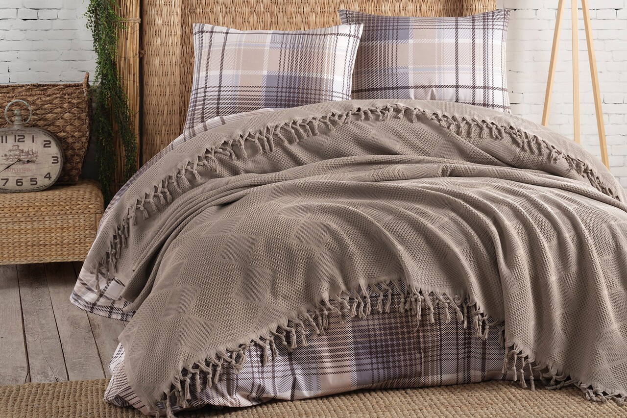 Set cuvertura de pat dubla Pique, 4 piese, 220x240 cm, 100% bumbac, Saheser, Mona, maro nurca