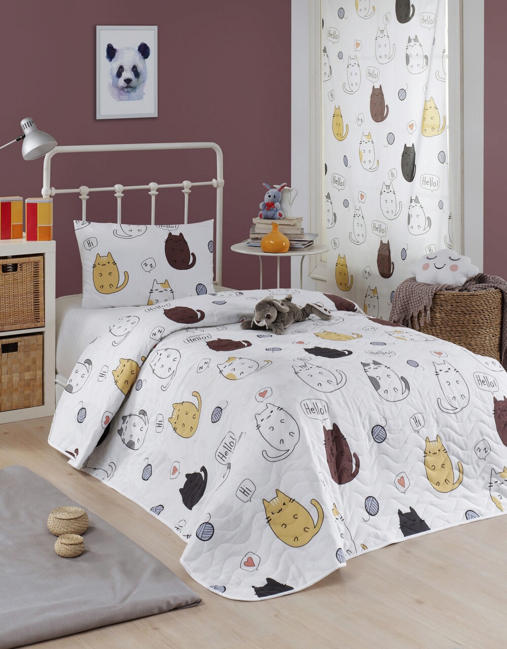 Set cuvertura matlasata Single 160x220 cm, 2 piese, Hello Cats - White, Eponj Home, 65% bumbac/35% poliester