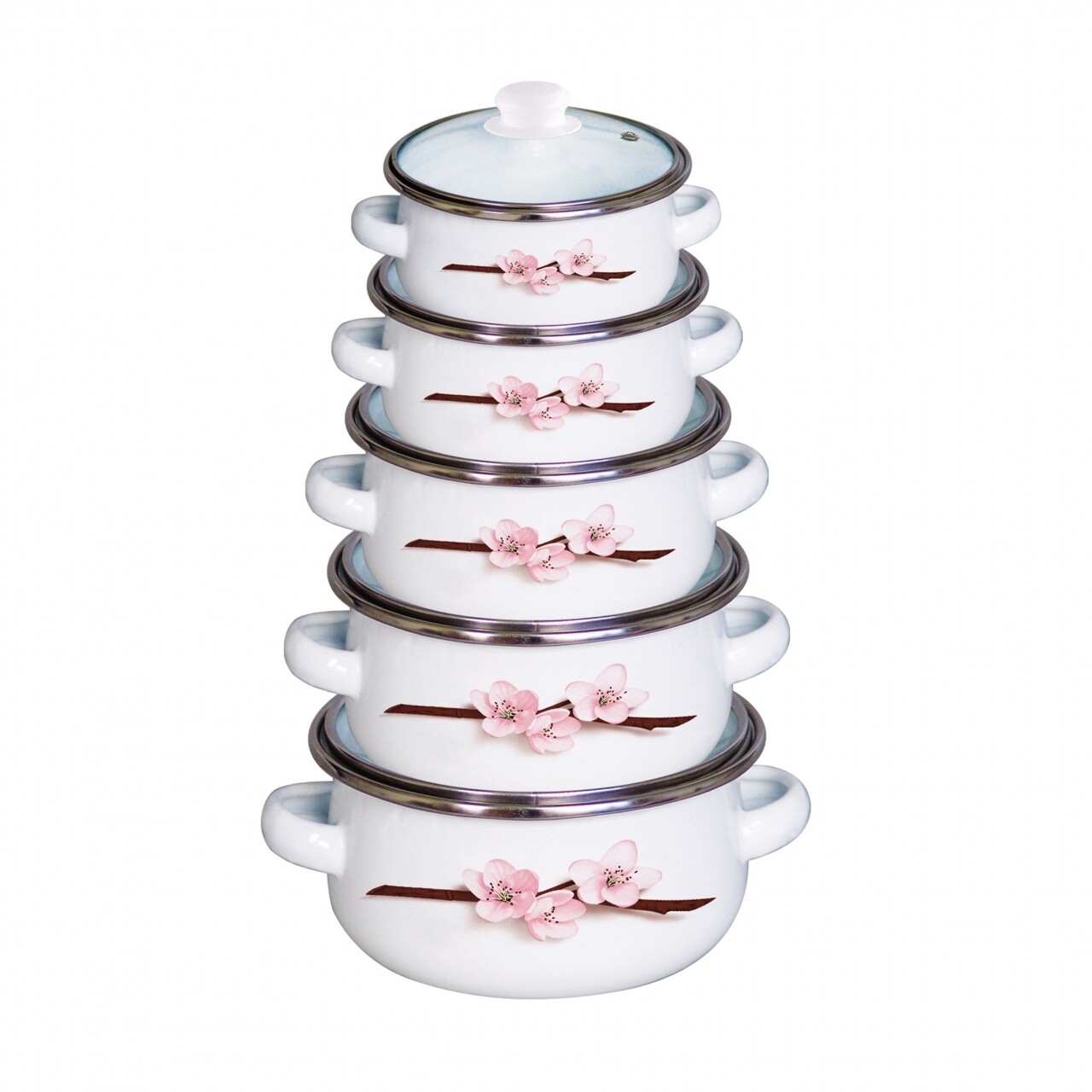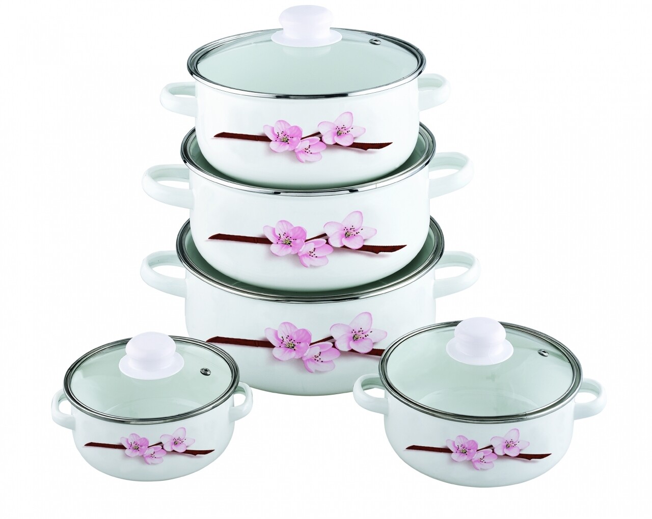 Set de gatit 10 piese, Cherry, Vanora Home, 0.5l, 0.8l, 1l, 1.5l, 2l, otel carbon emailat si sticla, multicolor