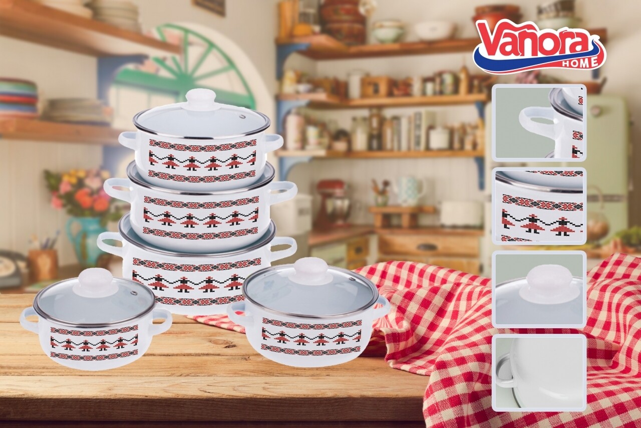 Set de gatit 10 piese, Traditional Bucovina, Vanora Home, 1l, 1.5l, 2l, 3l, 4l, otel carbon emailat si sticla, multicolor