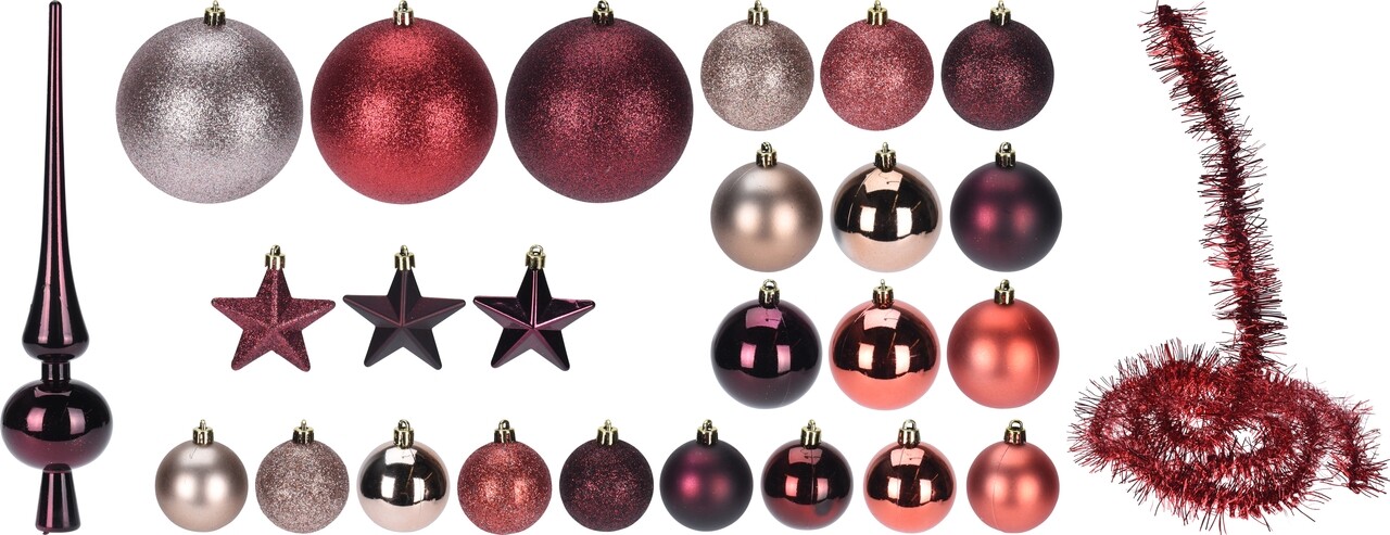41 de globuri cu diametru de 60 mm ( 3 culori asortate), 40 de globuri cu diametru de 50 mm, 10 globuri Star cu dimensiunea de 65x65x30 mm, 6 globuri cu diametru de 10 cm, 1 varf de brad si 2 ghirlande cu lungimea de 2 metri