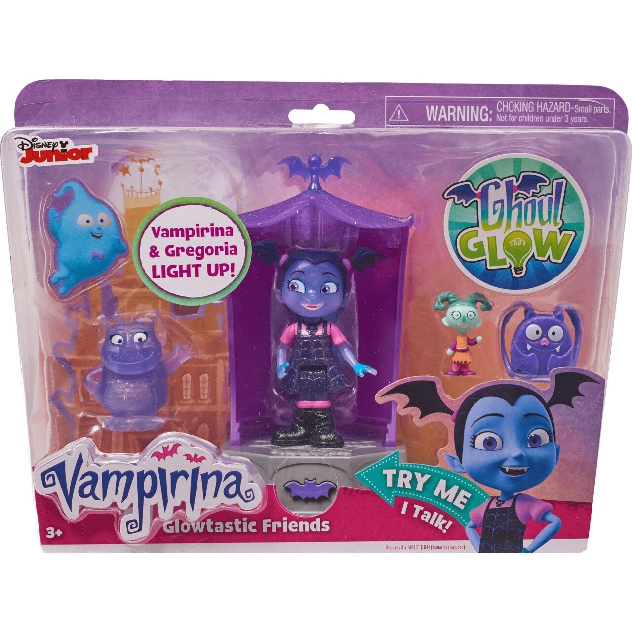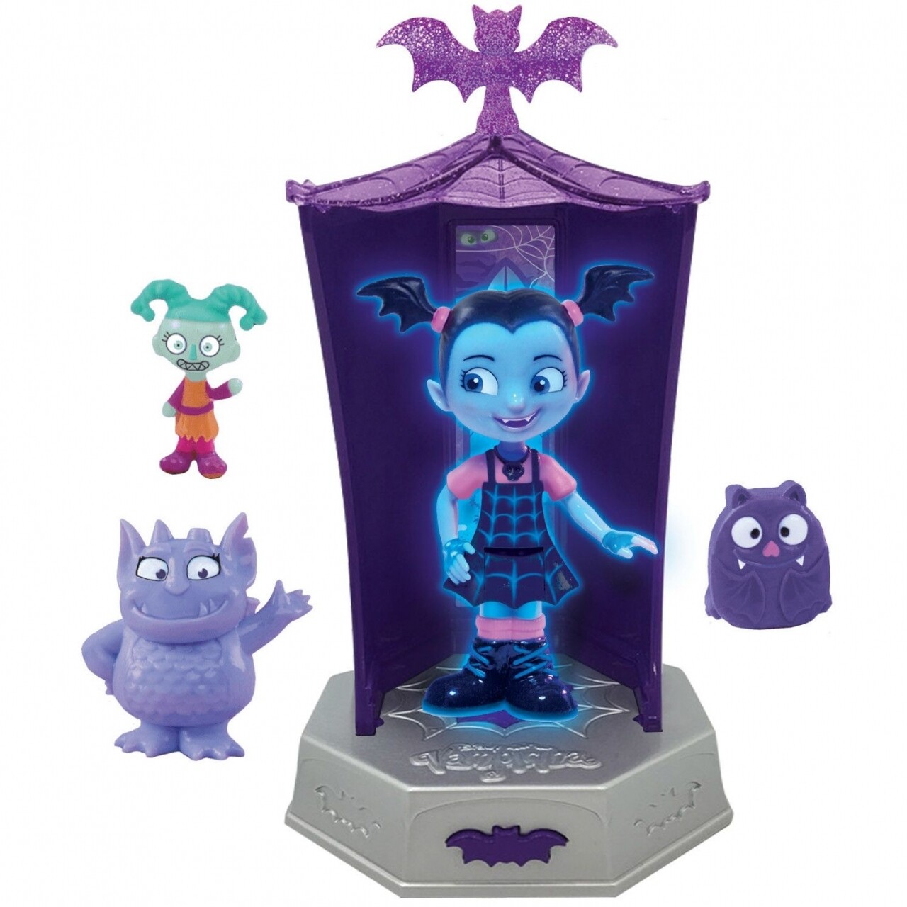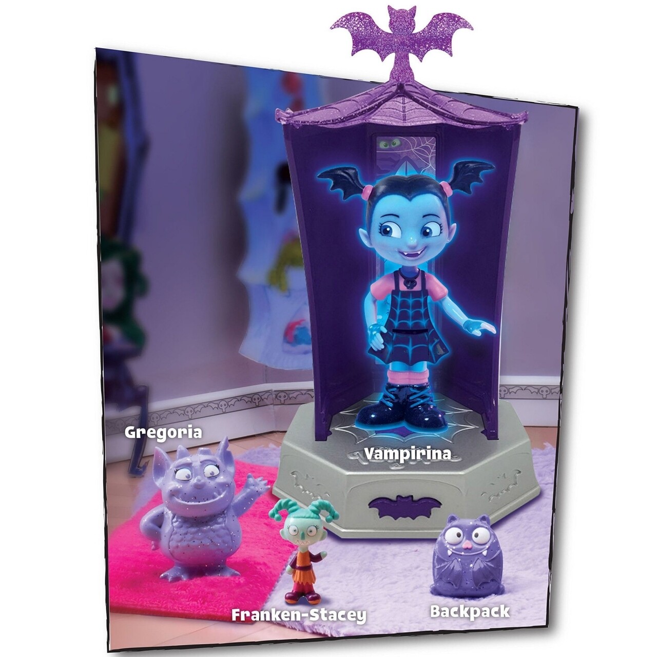 Cum e oare sa te muti la o scoala noua, intr-un oras nou, ba chiar intr-o alta tara, printre oameni… daca esti vampir? Familia Vampirinei e foarte prietenoasa, insa ea se teme ca nu va fi acceptata de colegi sau vecini pur si simplu pentru ca e altfel. Dar poate ca, pe langa firea ei sincera si generoasa, tocmai aceste deosebiri o fac speciala… Vampirina este o mica vampirita a carei familie se muta in Pennsylvania, unde vor administra o pensiune pentru vampiri si spiridusi. Intra in lumea noului tau personaj preferat Vampirina achizitionand setul cu figurine. Asezati figurinele in camera luminoasa si descoperiti efectele luminoase si sonore. Cuvintele reproduse de personaj sunt in limba engleza.
