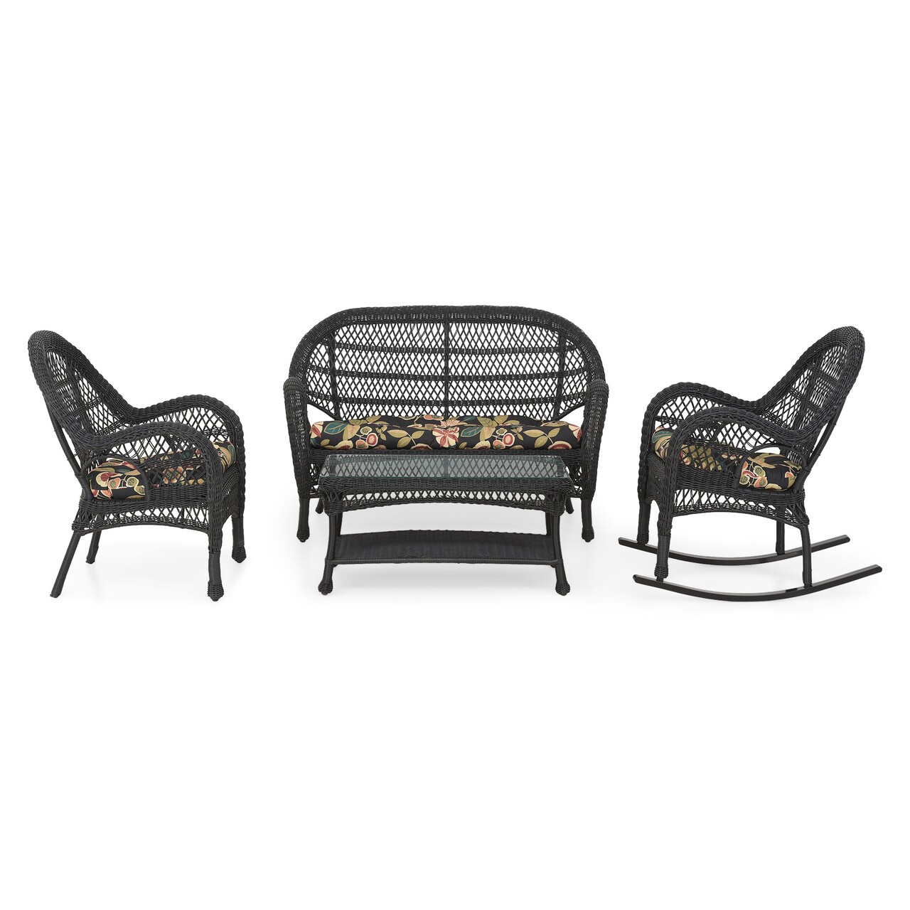 Set fotoliu, balansoar, canapea si masuta, Susan, otel, negru/multicolor
