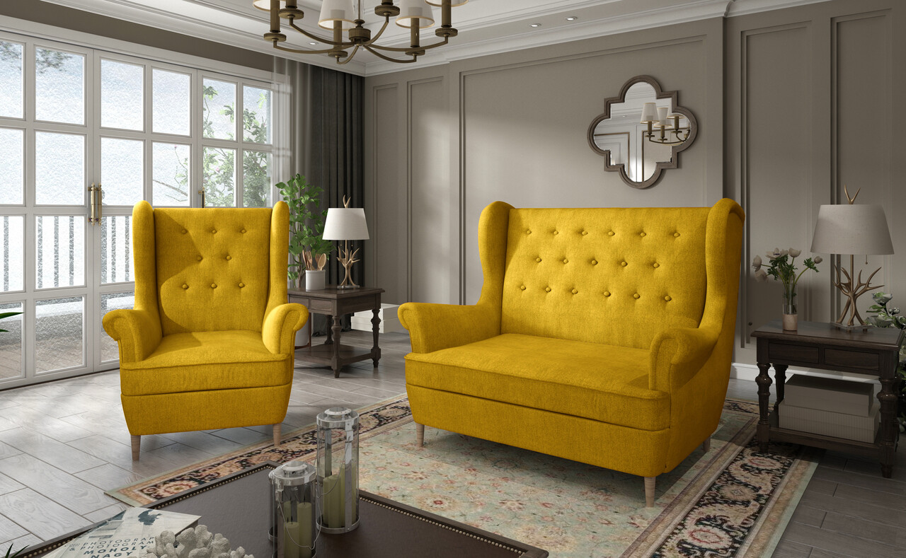 Set fotoliu si canapea ELTAP, Aros, 72x60x100 cm / 150x90x103 cm, lemn/poliester, galben