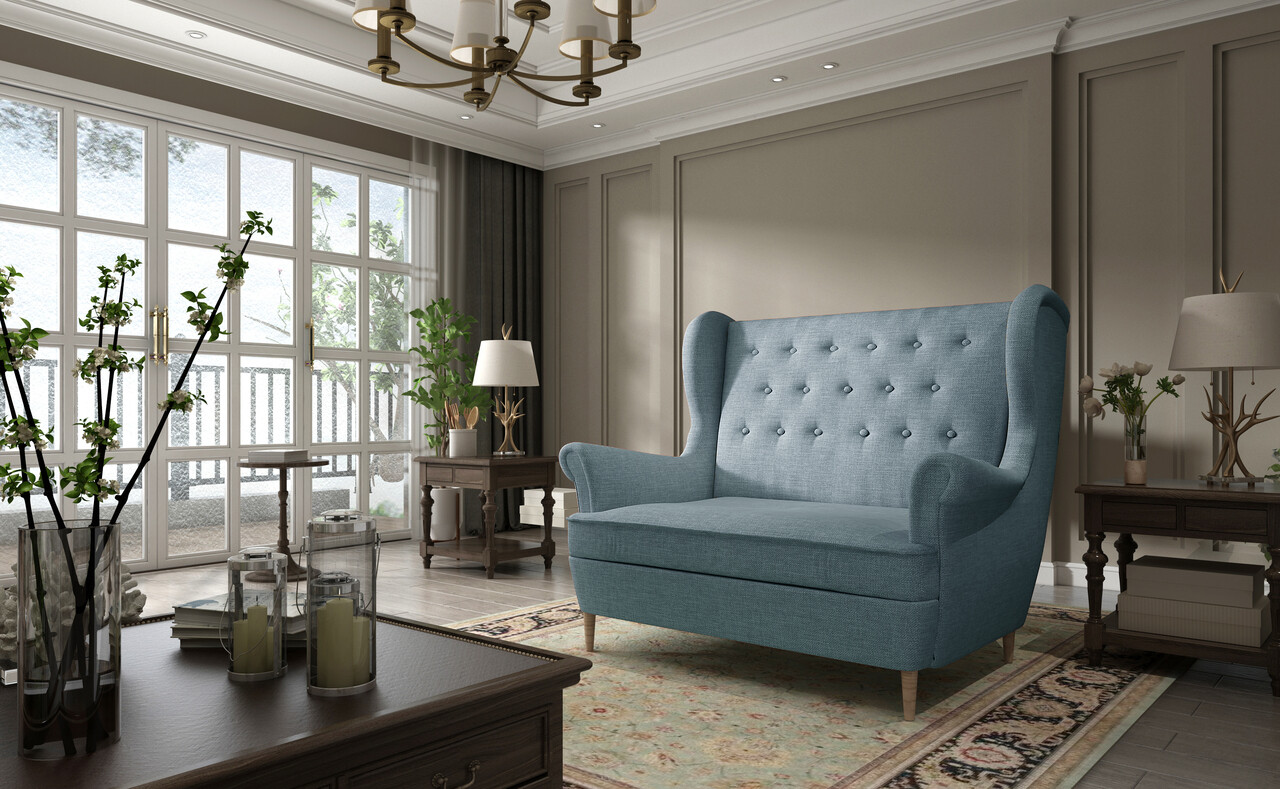 Set fotoliu si canapea ELTAP, Aros, 72x60x100 cm / 150x90x103 cm, lemn/poliester, albastru deschis