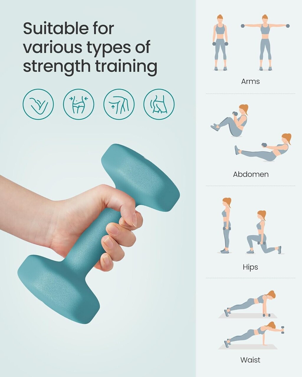 Set gantere fitness 6 piese cu suport, 2 x 1 kg + 2 x 2 kg + 2 x 3 kg, Songmics, neopren, roz/aqua/albastru
