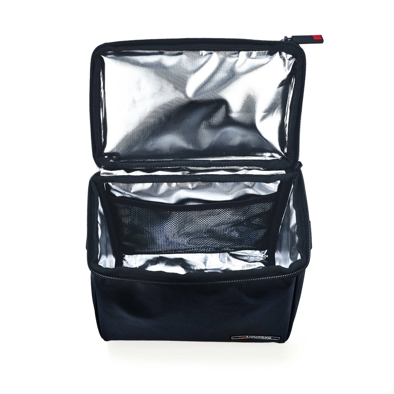 Interior acoperit cu material izolat pentru a mentine alimentele proaspete mai mult timp. Geanta termica are 2 buzunare, unul interior pentru tacamuri, servetele, etc. si unul exterior pentru obiecte mici. De asemenea, este prevazuta cu 2 compartimente principale: cel din partea superioara este pentru a depozita sticla de apa, cel din partea inferioara fiind pentru a depozita cele 2 caserole cu inchidere ermetica.