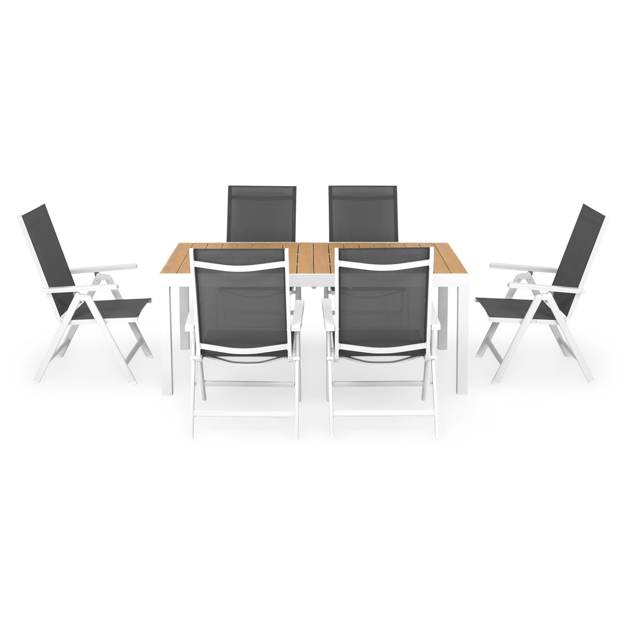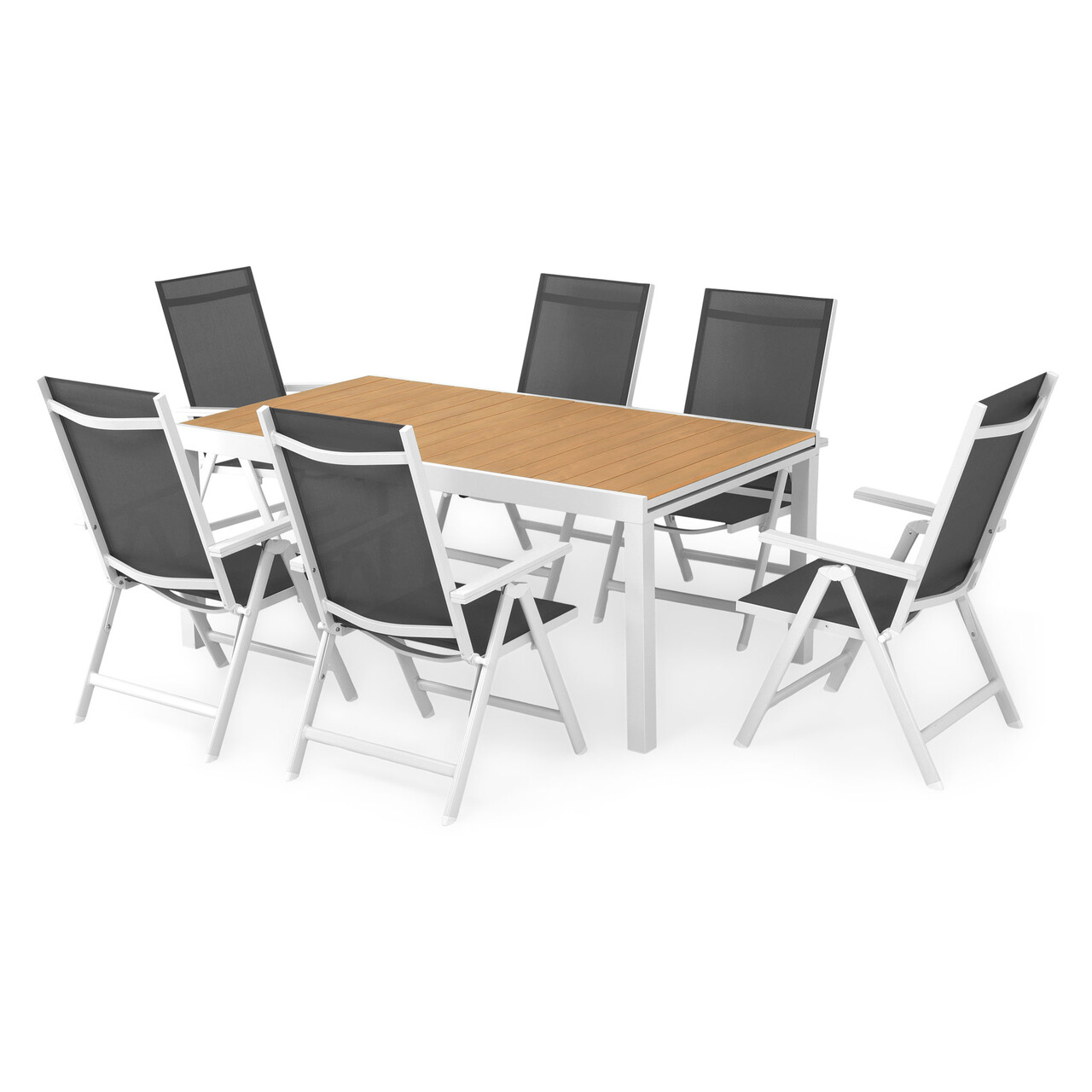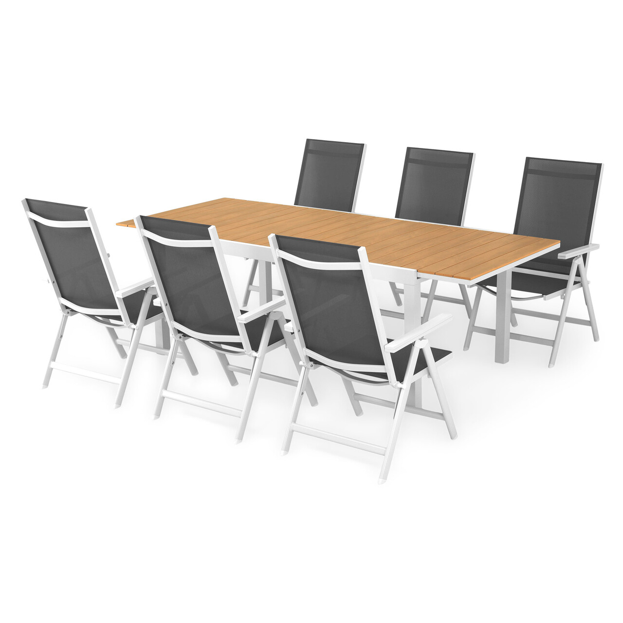 Sezutul si spatarul sunt realizate din textilina fina cu protectie UV. Masa este extensibila si scaunele sunt cu spatar reglabil.