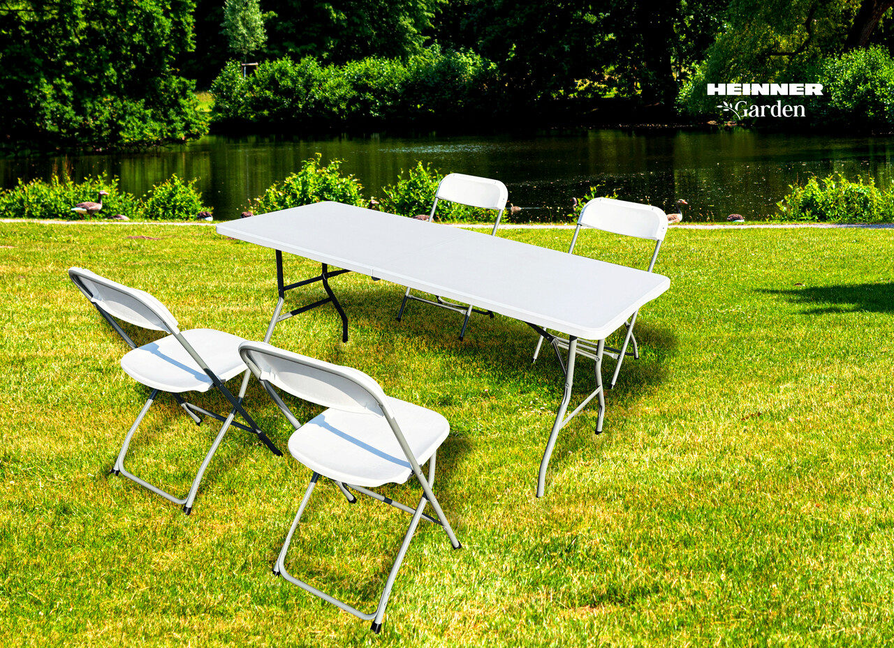 Set masa cu scaune pliabile Heinner, 180x70x74 cm/50x44x80 cm, otel/HDPE plastic, alb